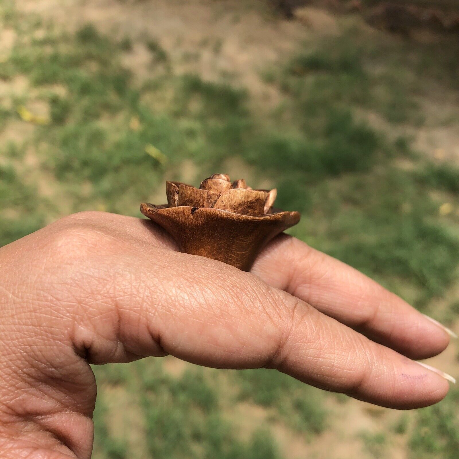 Holz Rose Blume geschnitzt Statement Ring, handgefertigt handgeschnitzt handgefertigt Cocktailschmuck, 35 mm Durchmesser, US 8 Ringgroße