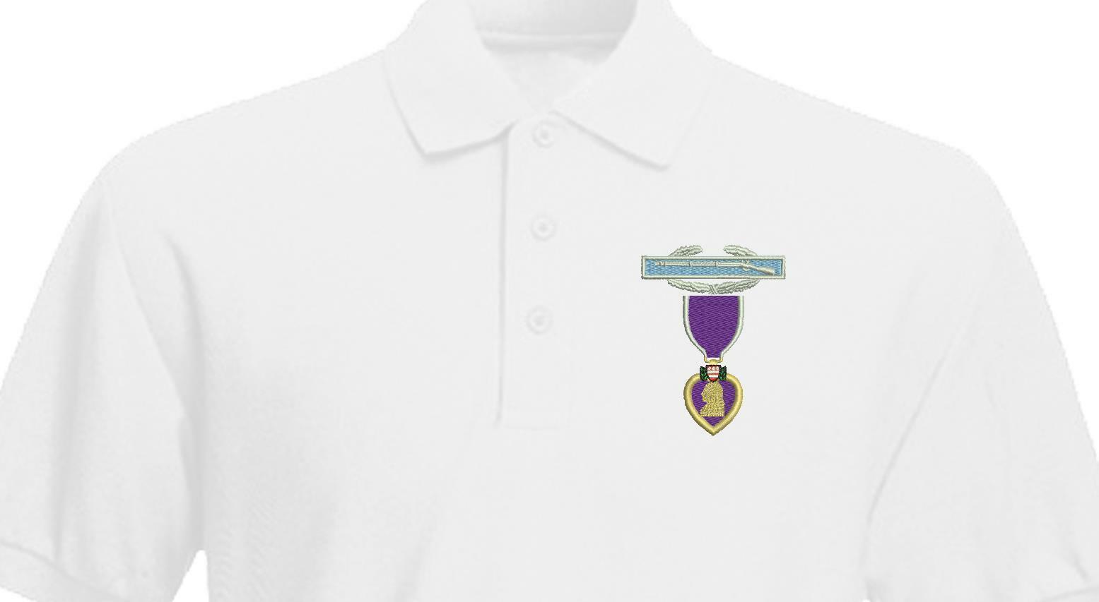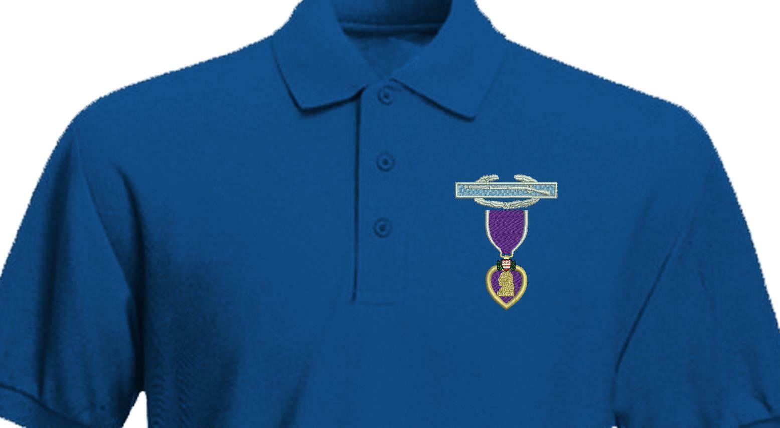 One Men's Polo Shirt with embroidered CIB and Purple Heart design as pictured