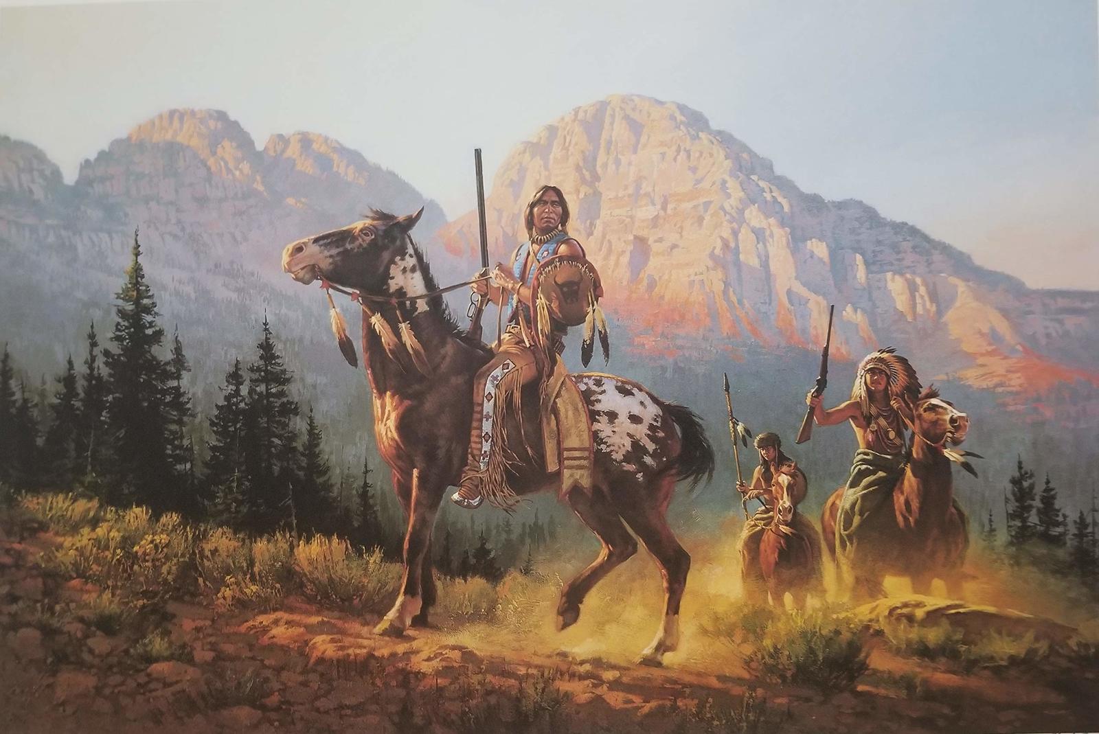 Product description: Top Gun is a signed and numbered limited edition print by Chuck Ren. The image depicts a Native American warriors on their horses with a majestic mountain range in the background. The image size is 16 3/4" x 25". Overall size is 20 1/4" x 28". It was published by Gray Stone Press in 1987 in an edition size of 1,800. About the Artist: Chuck Ren grew up in the Southwest surrounded by Cowboys and Papago Indians. He enjoyed Arizona Highways and was familiar with the work of Fredric Remington and Charles Russell. After earning a degree in fine art from the University of Arizona in Tucson, he worked for Lockheed Aircraft and Computer Sciences Corporation as a commercial artist. He later became a free-lance illustrator. He designed display posters for movies, and created the official 1980 Super Bowl Poster as well as posters for all the NFL teams. The idea of creating Western art intrigued Ren. He continued his commercial career for a few years but soon his commercial assignments became "tedious". He couldn't wait to get them finished so that he could return to his Western paintings. In 1982, he moved to Sedona, Arizona. He enjoyed acquiring Western artifacts and whenever possible he used them and clothing from the era of the Plains Indians on his models. Ren's early Western paintings were well received. The completion of "Mystic Warrior" and the popularity of its prints gave him wide national acclaim. Respect for the spirit of the Plains warrior and and attempt to keep the memory of his significance from vanishing from the American Consciousness provided a two-fold impetus for the artist. He did meticulous research to adhere to his strict standard of authenticity. He would also have costumes reproduced for him whenever he could not locate the original. Chuck Ren passed on in October 1995, a distinguished talent leaving a legacy of painted detail about the Native Americans.
