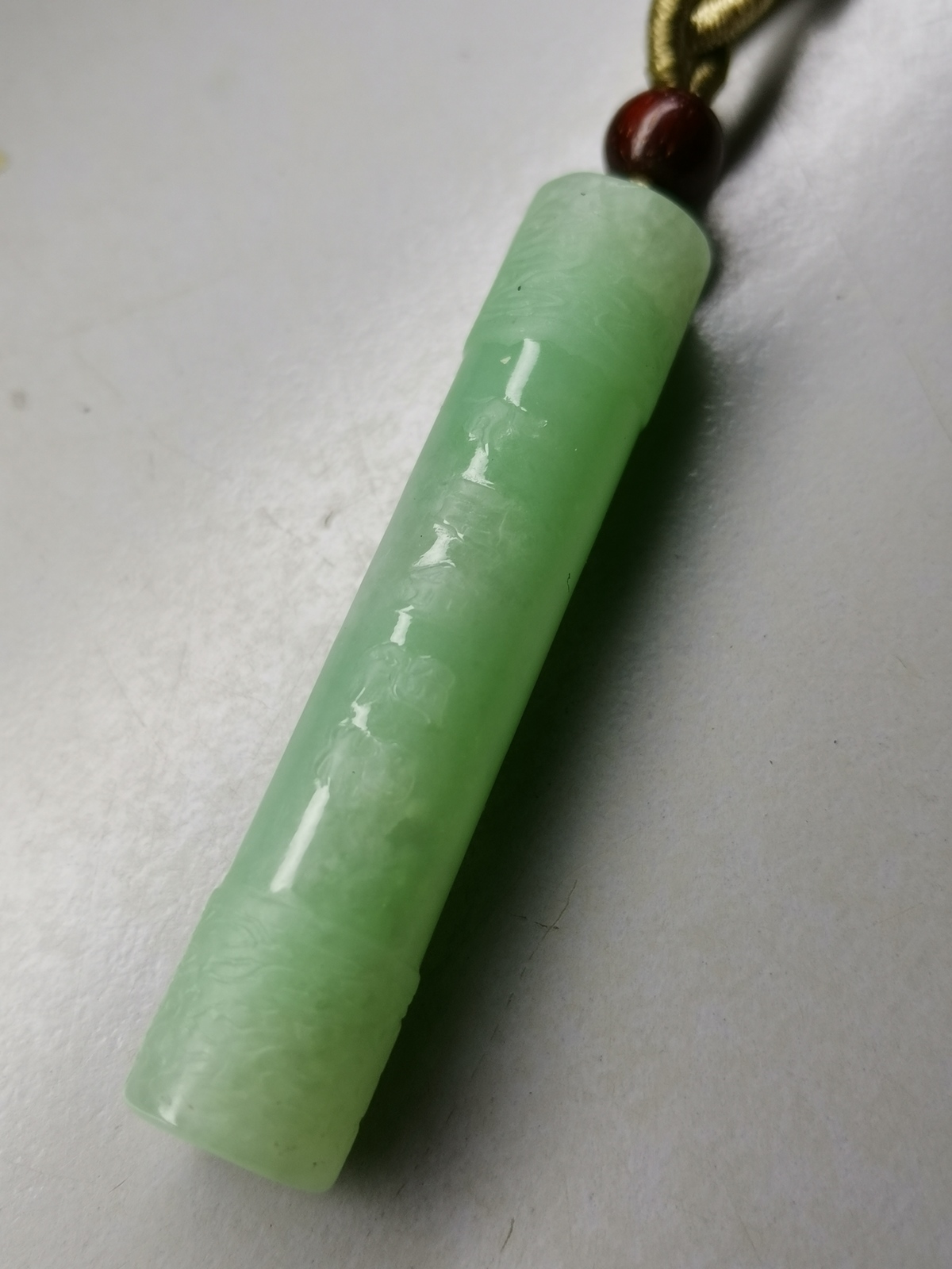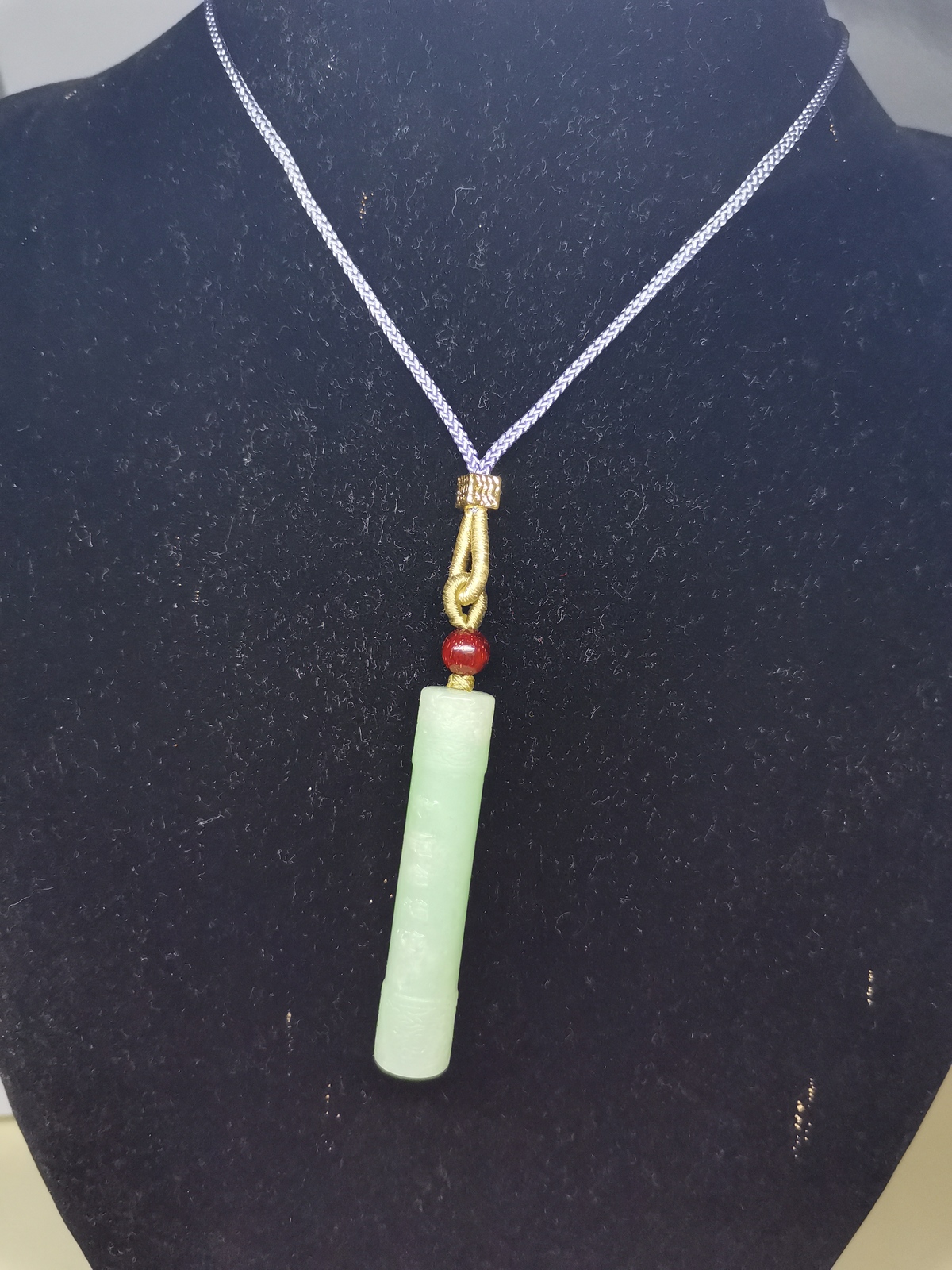 This is a natural Burmese jadeite, belonging to an extremely rare variety of fruit green color, which usually only appears in high-quality jadeite. It is carved from an ice-type natural jadeite raw stone of fruit green color, and has been meticulously and delicately carved into the form of a golden cudgel, with smooth and natural lines and exquisite craftsmanship, making it highly valuable for collectors. This pendant comes with a certificate of A-grade natural jadeite, proving that its material is completely from natural ore, with extremely high preciousness and rarity. Its size is 59.10mm long, 9.60mm wide, and 9.40mm thick, weighing 13.75 grams, equivalent to 68.75 carats. Its moderate size is very suitable for wearing. Jadeite has been a highly valued gemstone since ancient times, and is regarded as a symbol of auspiciousness in Chinese culture. This extremely rare variety of fruit green color is particularly sought after by collectors. The carving of this jade pendant has a very profound meaning, as the golden cudgel symbolizes the removal of evil and the elimination of disease, making it a lucky charm. Wearing this pendant can not only increase one's aura and charm, but also enjoy its auspicious power, making it a valuable collectible item.