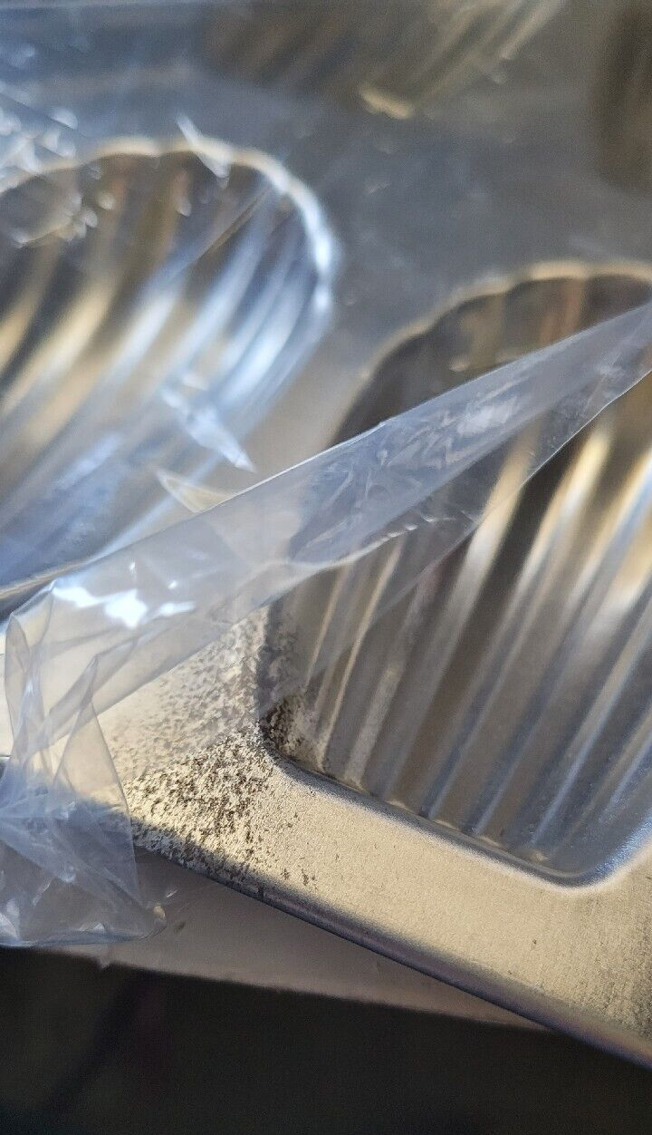 This cookie pan is new in original box and plastic as seen in the photos. There is a mark on the metal as seen in the photos. Not sure what it's from or what it is.