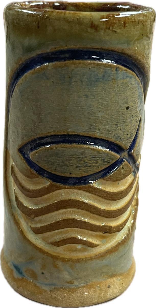 Crafted with serene blue and earthy brown tones, this shot glass embodies tranquility and elegance. At its heart, an artfully embossed Jesus fish swims gracefully above calming waves, serving as a timeless symbol of faith and guidance.