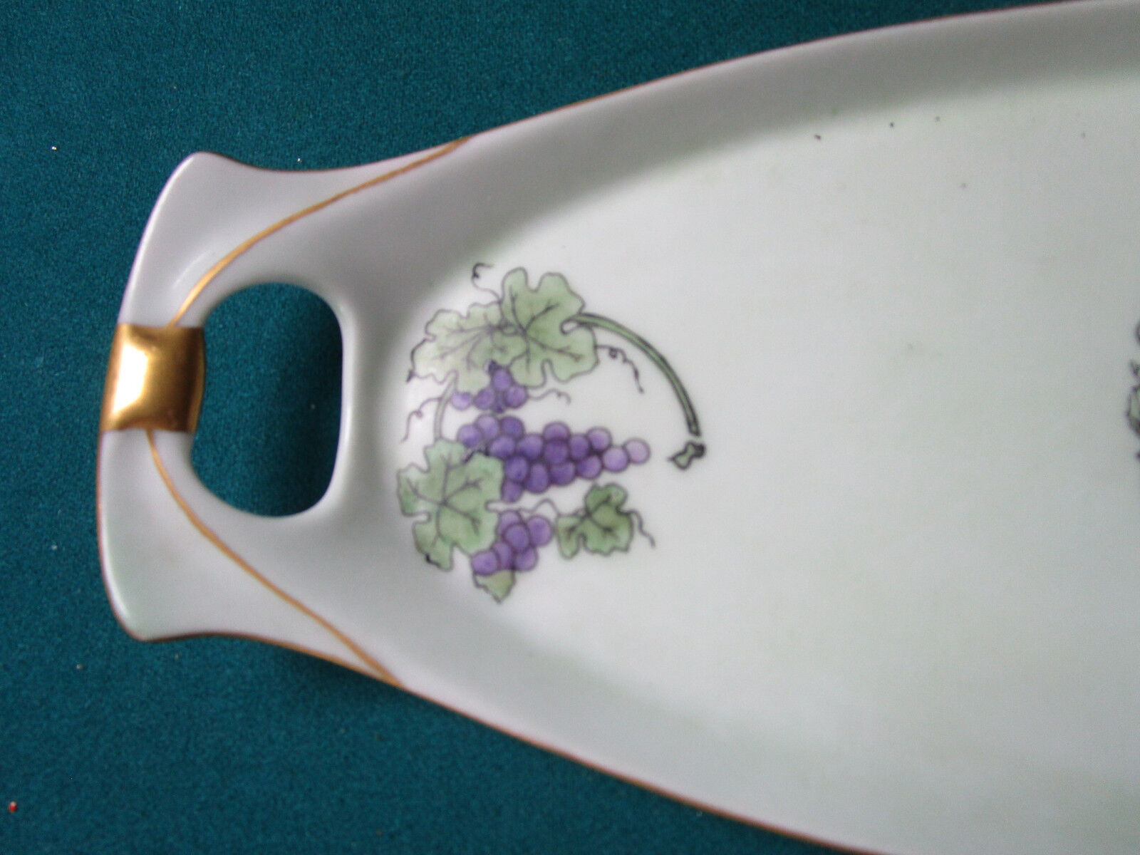 REINHOLD SCHLEGELMILCH - R.S. GERMANY c1910s large two handle tray decorated with fruits and grapes,, 14" long by 5" wide, very good condition, some light surface scratches commensurate with age [A5RS5BSKT]