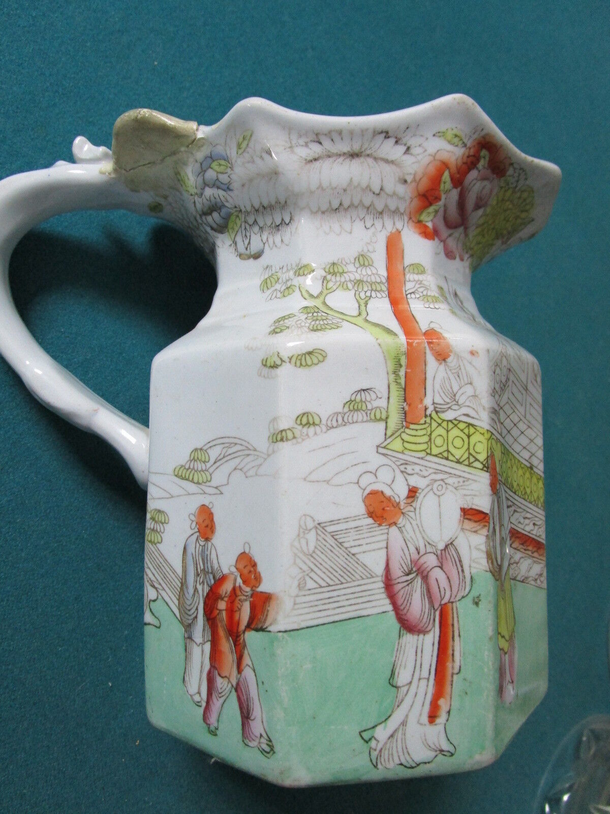 Mason's Ironstone China PITCHER jug, decorated in the Chinese pattern, marked on back , very good condition, surface scratches commensurate with age and it has a small repair shown in picture. 7" Tall X 8 1/4" spout to handle