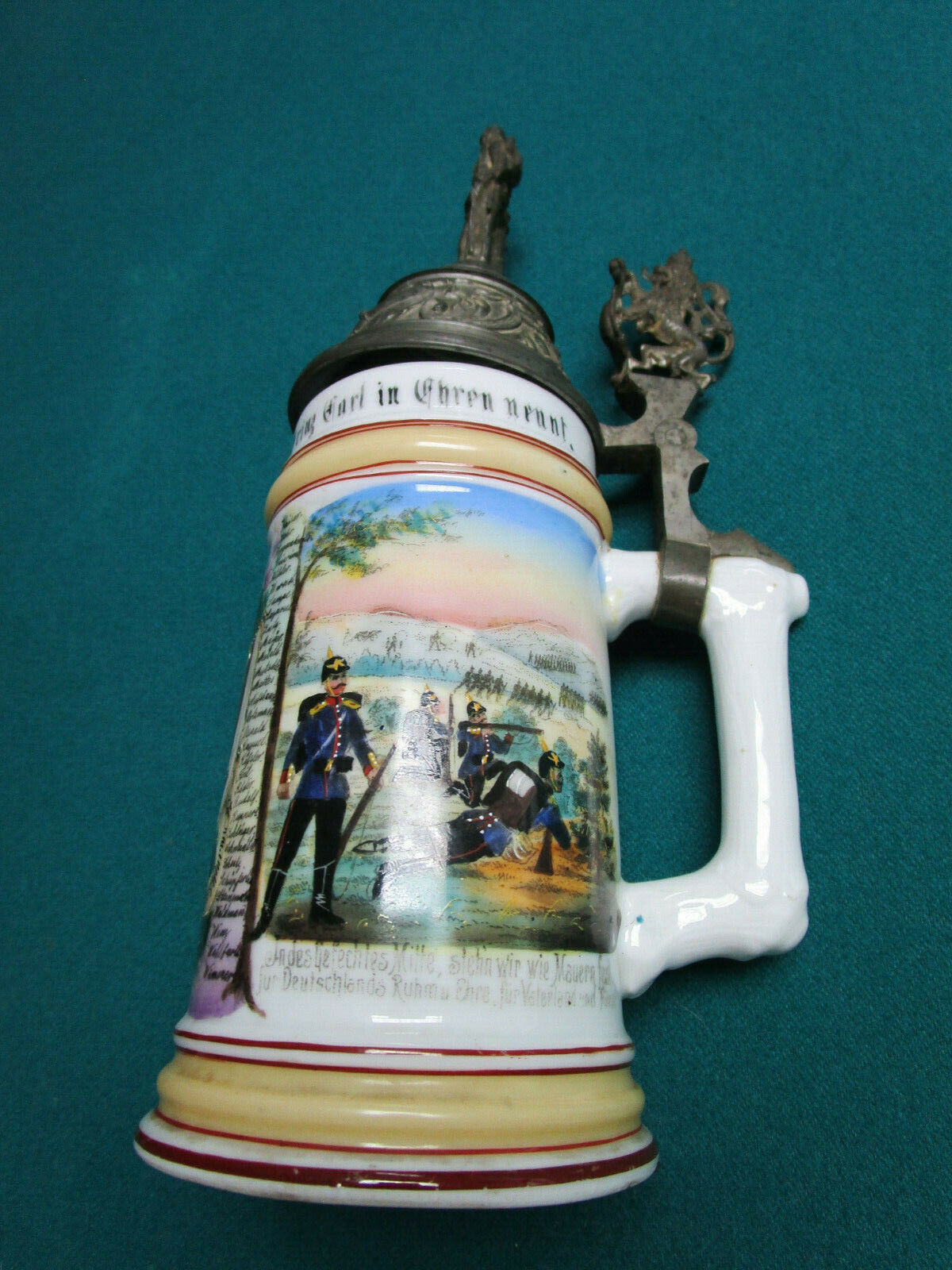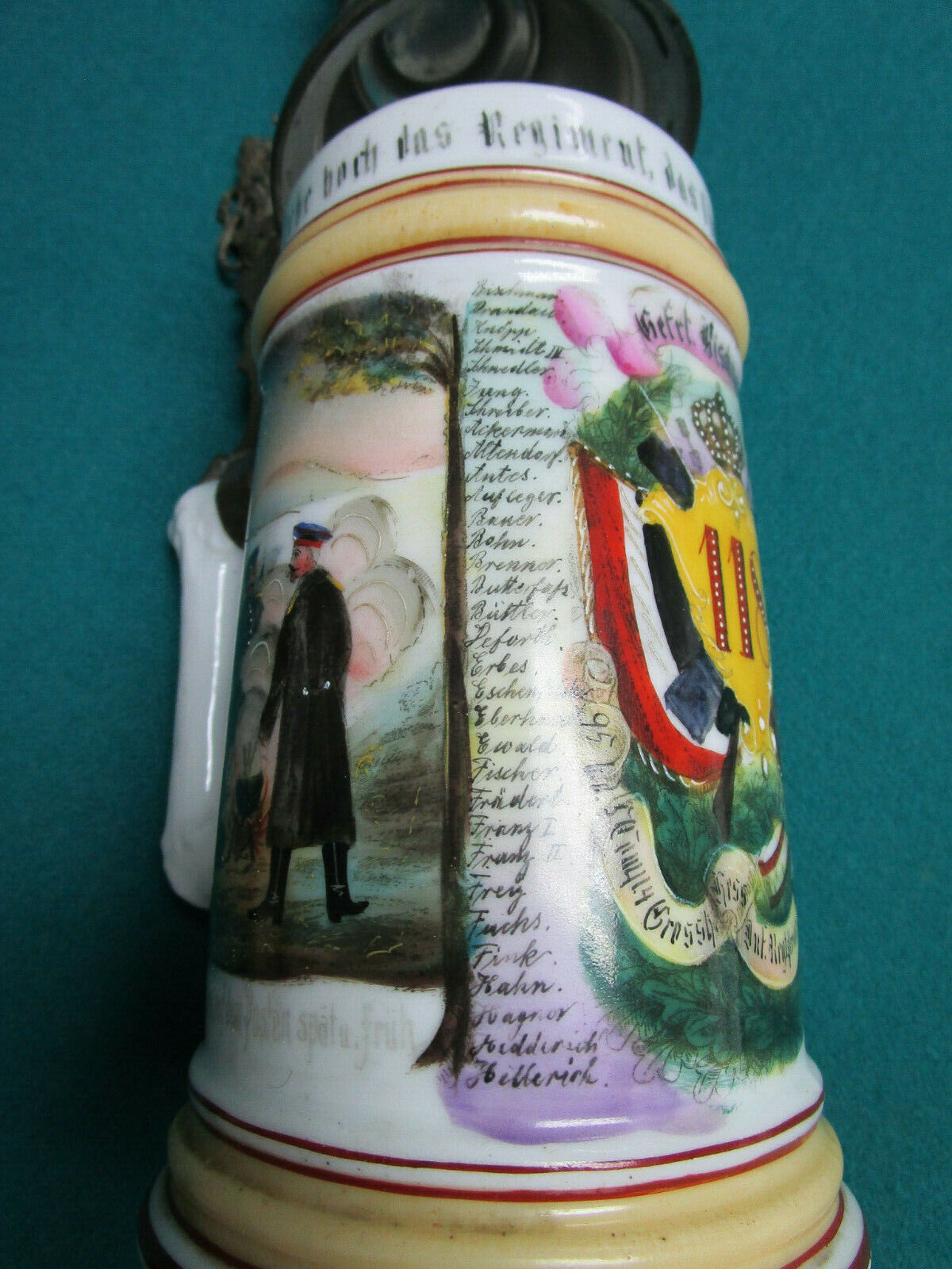 2- Regimental stein of the 4 Comp 4 Grossherzogisches Regiment 118 at Worms with pewter lid and Litho dated 1896-1898 10" [*STEINBX] LIGHT SPIDER WEB HAIRLINE ON BASE