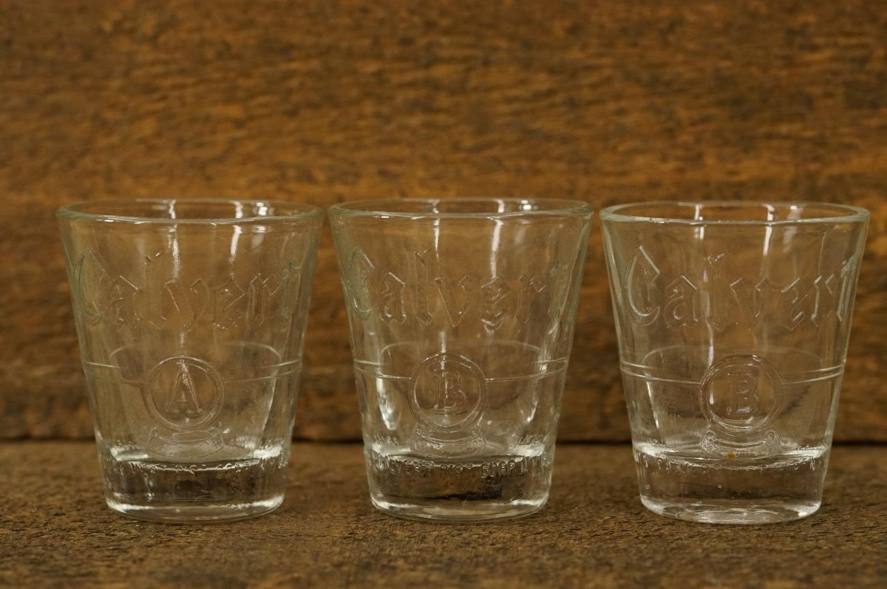 Vintage Advertising Barware Shot Glasses (3 pc lot) CALVERT Canadian Whiskey Raised Logo. Measures 2.25" tall.