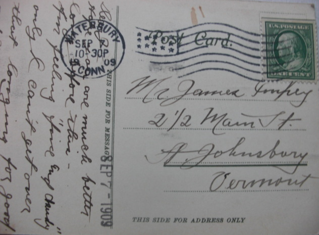 Green Ben Franklin one Cent stamp post marked Sep 7, 10:30 pm., 1909 |