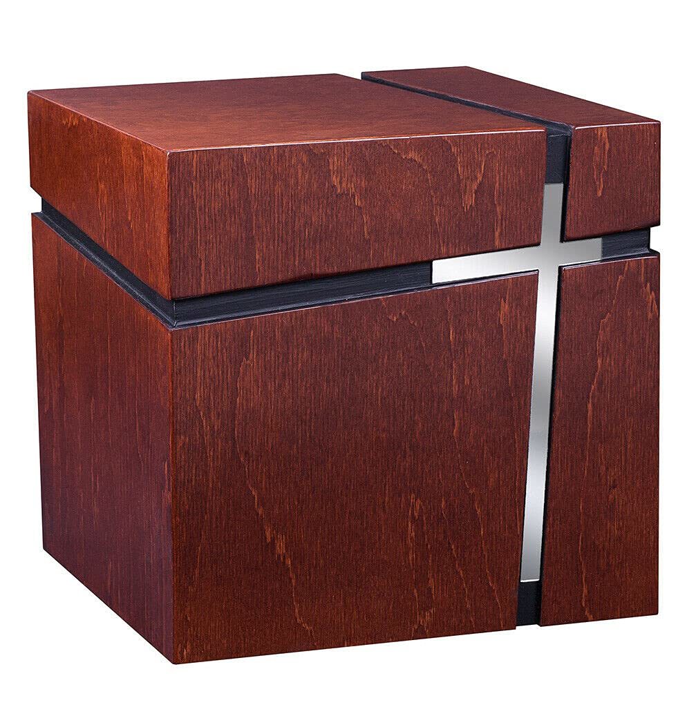 Modern cremation urns are gaining popularity lately. For this reason, Remember Forever has actually seen to it to bring you a special range of original modern-day cremation urns to select from. This is one instance from our comprehensive collection of funeral urns. Handcrafted from wood, this urn in the shape of dice is really original. Its contemporary appearance is nevertheless still really sophisticated as the wood grain is extremely nice, and also the means the geometric inlaid layout highlights the shape of a cross is really one-of-a-kind. The urn opens up at the bottom and it is fairly large, determining 19cm by 19cm.
