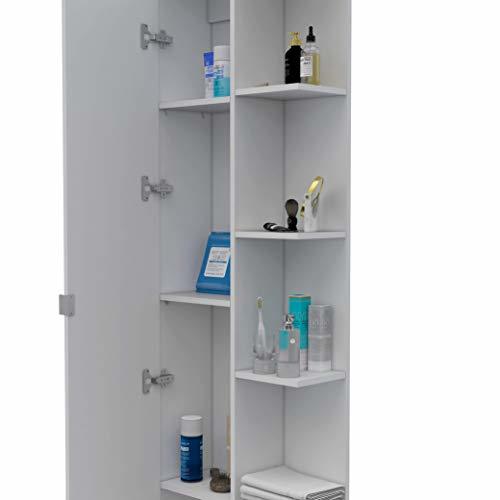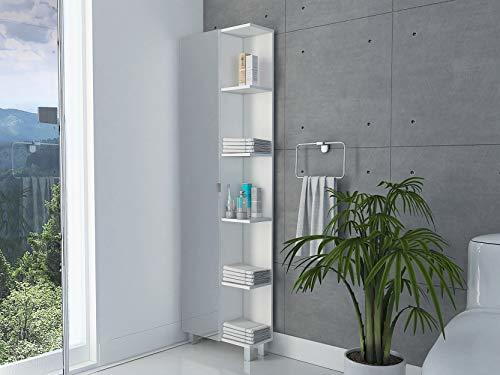 Product description: This large multilevel cabinet came to the market to meet your needs. Thanks to its large number of shelves, you can store many quantities of accessories or whatever you need to have on hand inside your Bathroom. Its great height and thinness make it easy to accommodate this piece of furniture inside your bathroom without taking up much space; you won't even feel it took up space. Incredibly, it has so many shelves for your daily use, you will have plenty of room to store everything you want, and best of all, it will not be necessary to put a mirror on your wall because this beautiful piece of furniture has one, you will give more freedom to your Bathroom because you have a linen cabinet that literally will be an all in one for your Bathroom. The Los Angeles Mirror linen cabinet is an excellent product for your Bathroom, and it will provide you that extra storage space perfect for storing your linens, towels, or toiletries. Featuring a 58 high single door cabinet with a mirror and three interior adjustable shelves. Also, five exterior shelves are perfect for displaying your decorative items. Four adjustable metal legs will give help you have a sturdy cabinet on any uneven floor. A wall installation kit is provided to avoid any type of tip-over accidents. Product dimensions are 20.1 W x 8.5 D x 62 H It is made of engineered wood in a White finish.