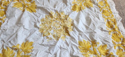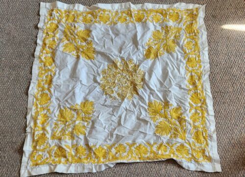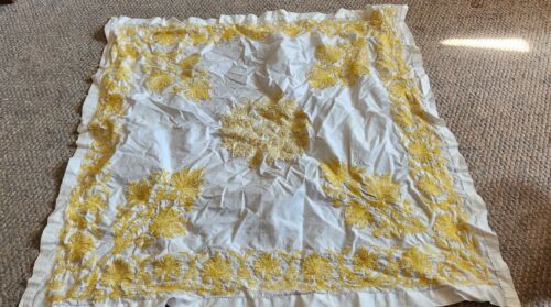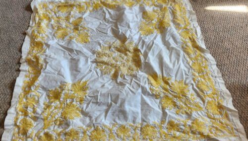 Vintage White Tablecloth Gold Embroidered Floral Plant Pattern Flower 32x33