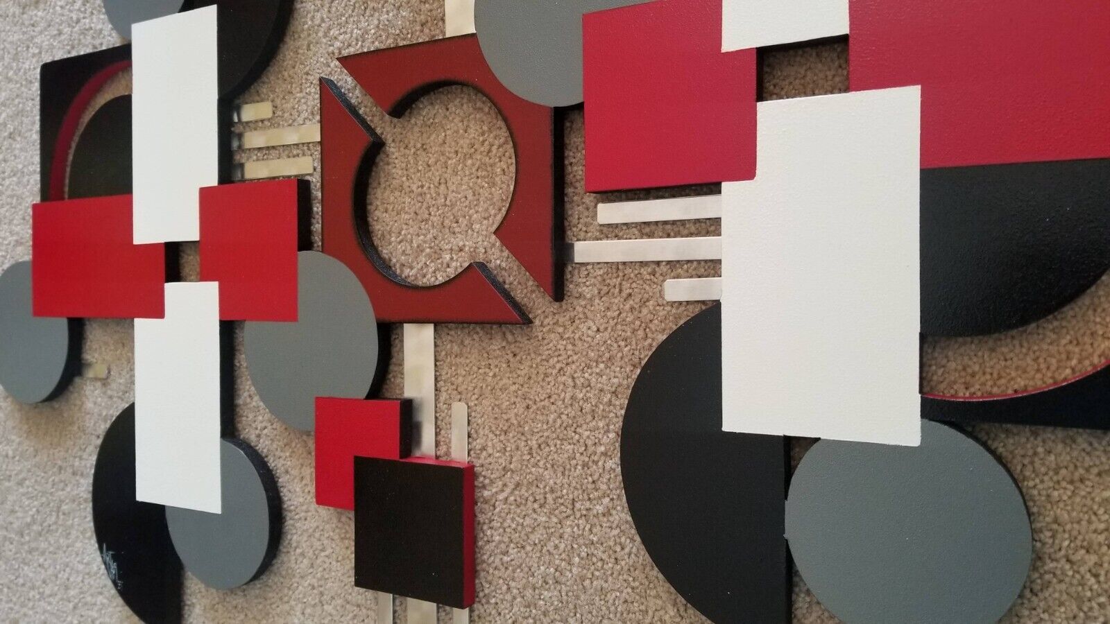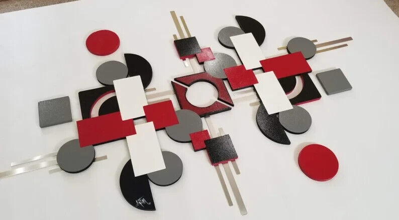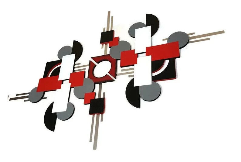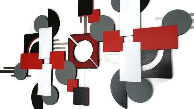 Contemporary Red Black Gray Modern Wood Metal Square Wall Sculpture 56x36 Art69