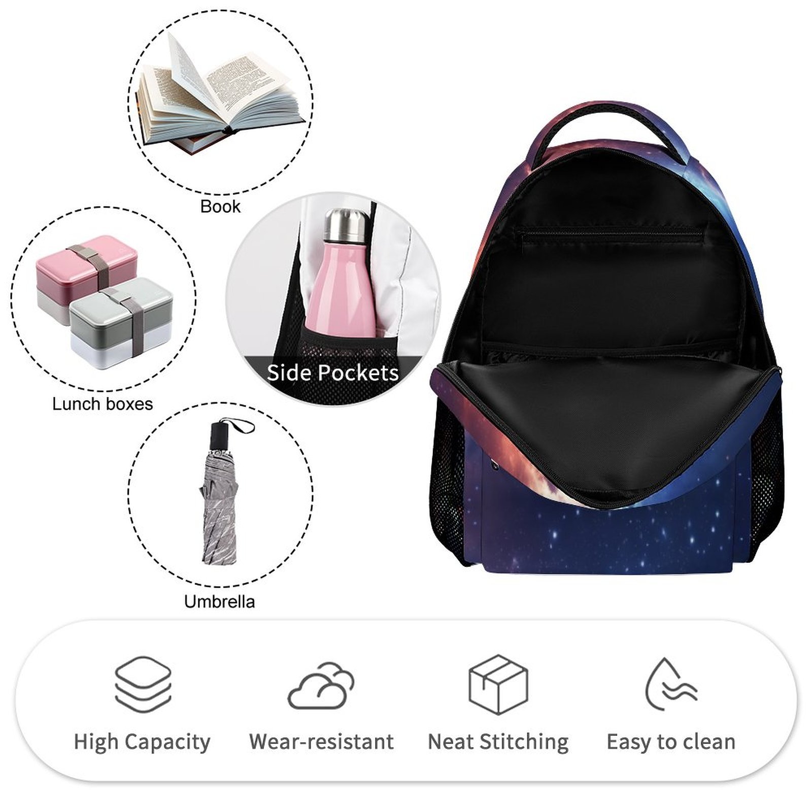 4, Practicality: double zipper design, side pockets can be placed in water cups, umbrellas and other items, sturdy and durable.