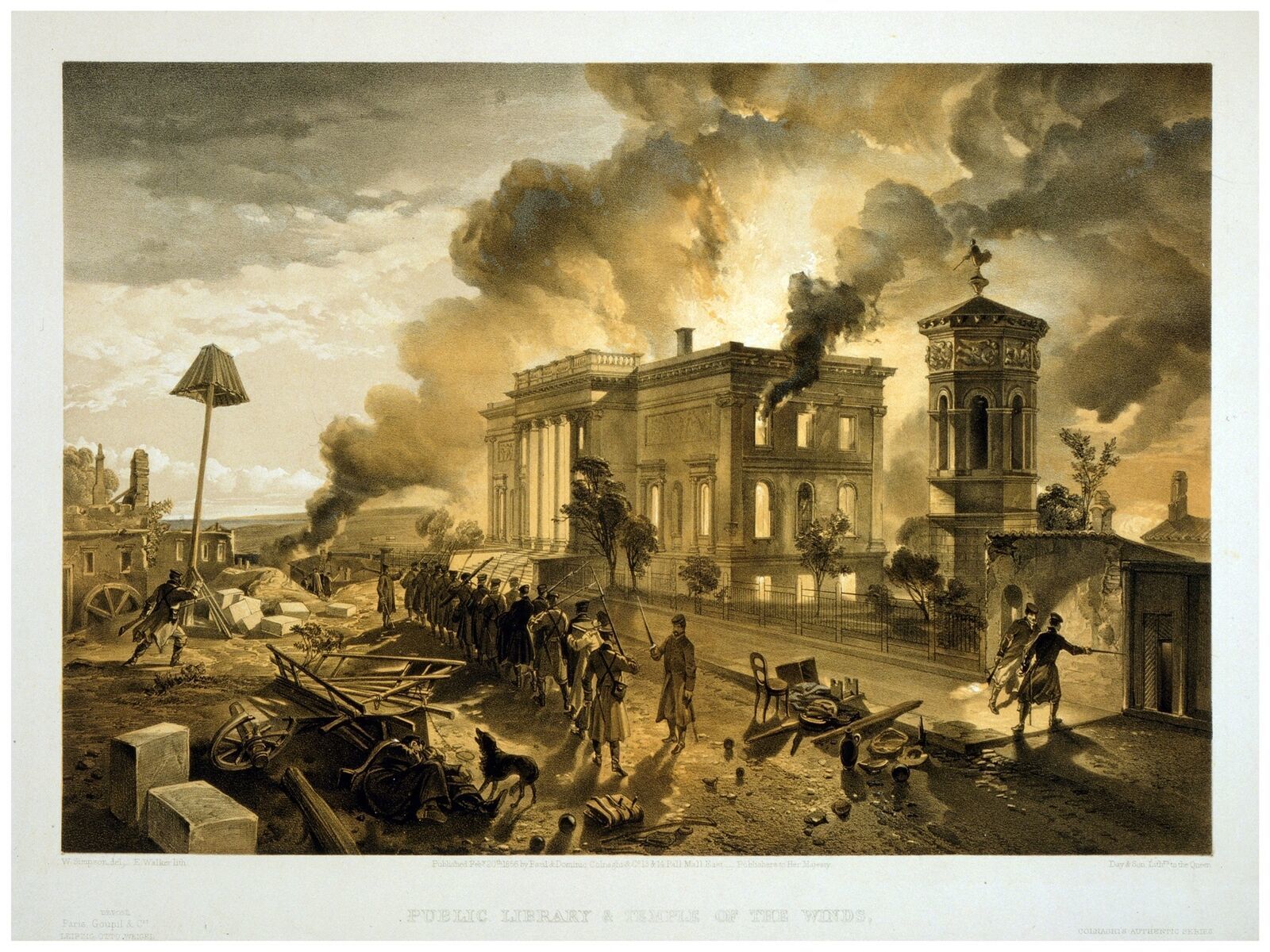 4423.City building burning.people watching.POSTER.decor Home Office art