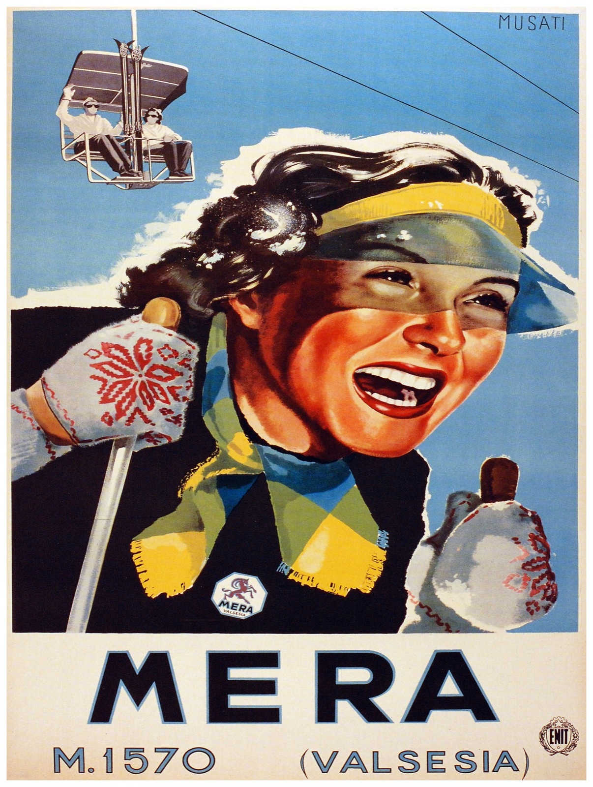 9826.Mera.woman skiing.couple on lift.Travel POSTER.Exciting wall ski decor art