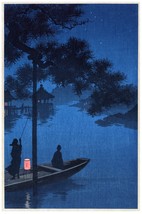 7552.Two people on small boat on serene lake at night.POSTER.art wall decor