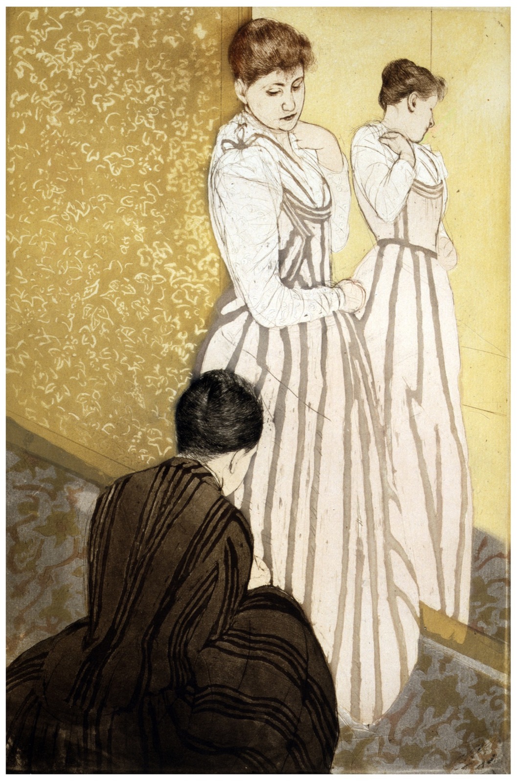 7520.Woman being fitted for a dress.stands before mirror.POSTER.art wall decor