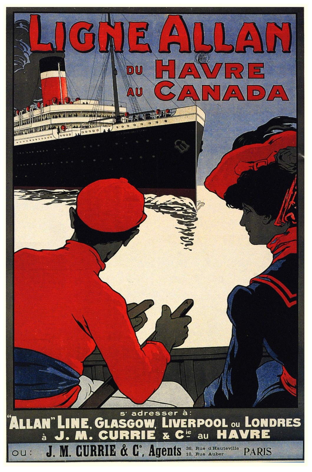 7572.Ligne Allan.Man & woman dressed in red wait for boat.POSTER.art wall decor