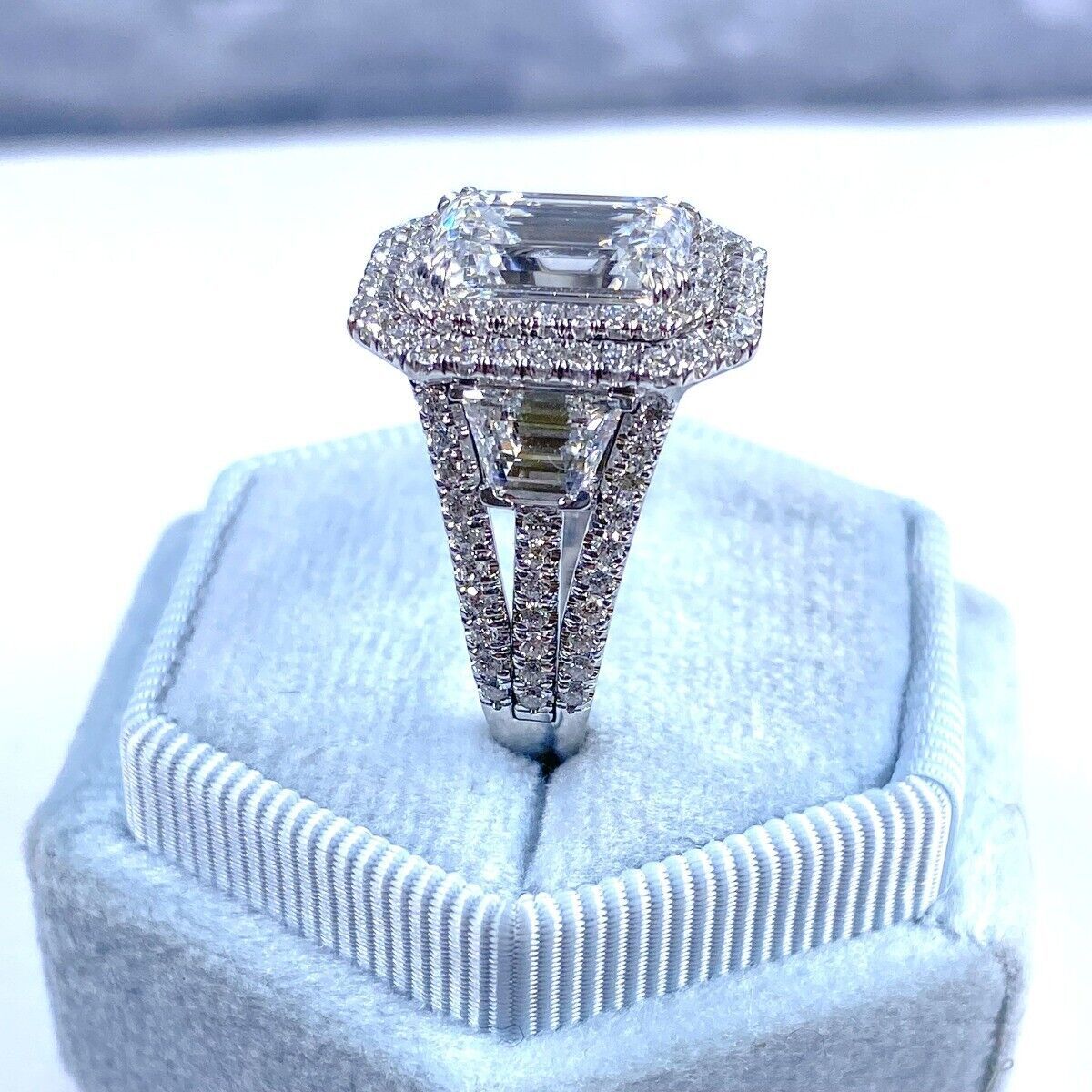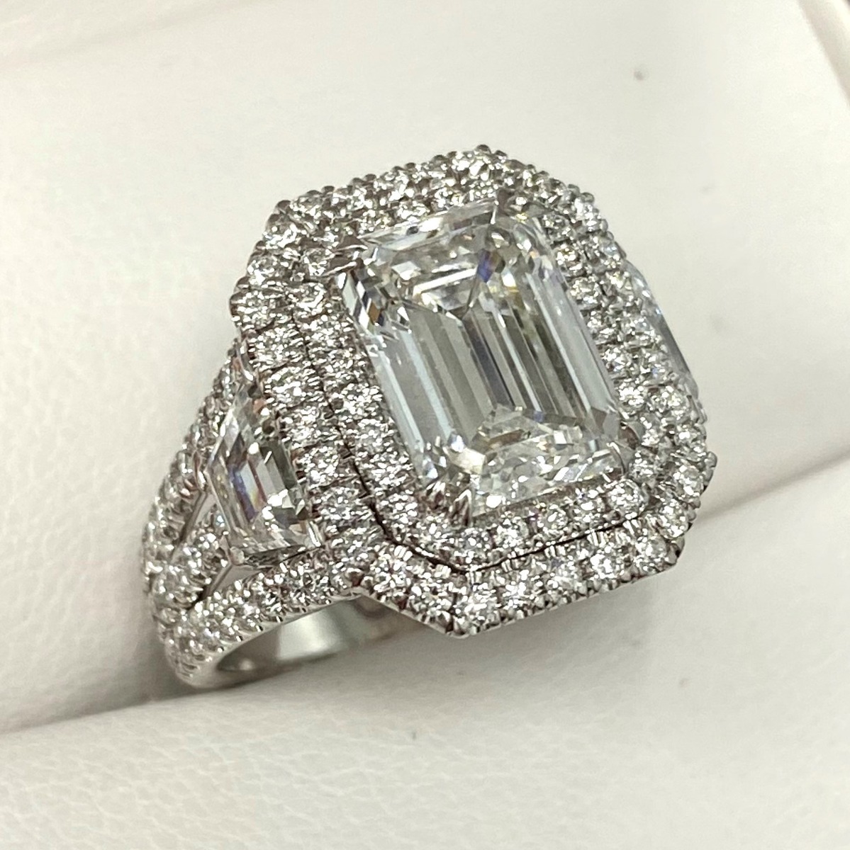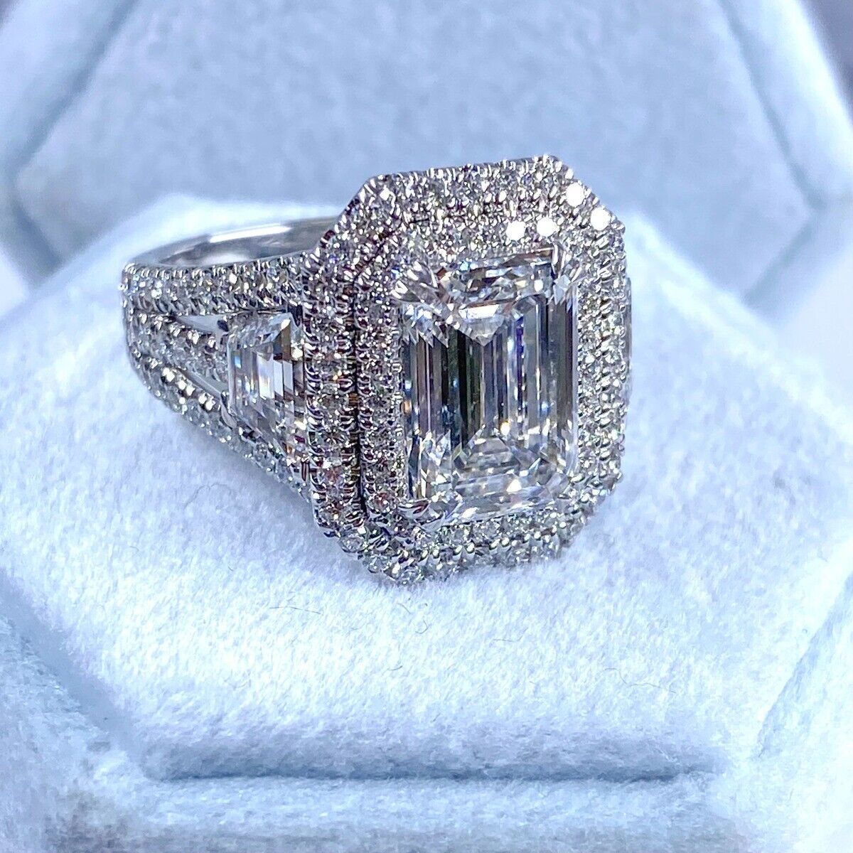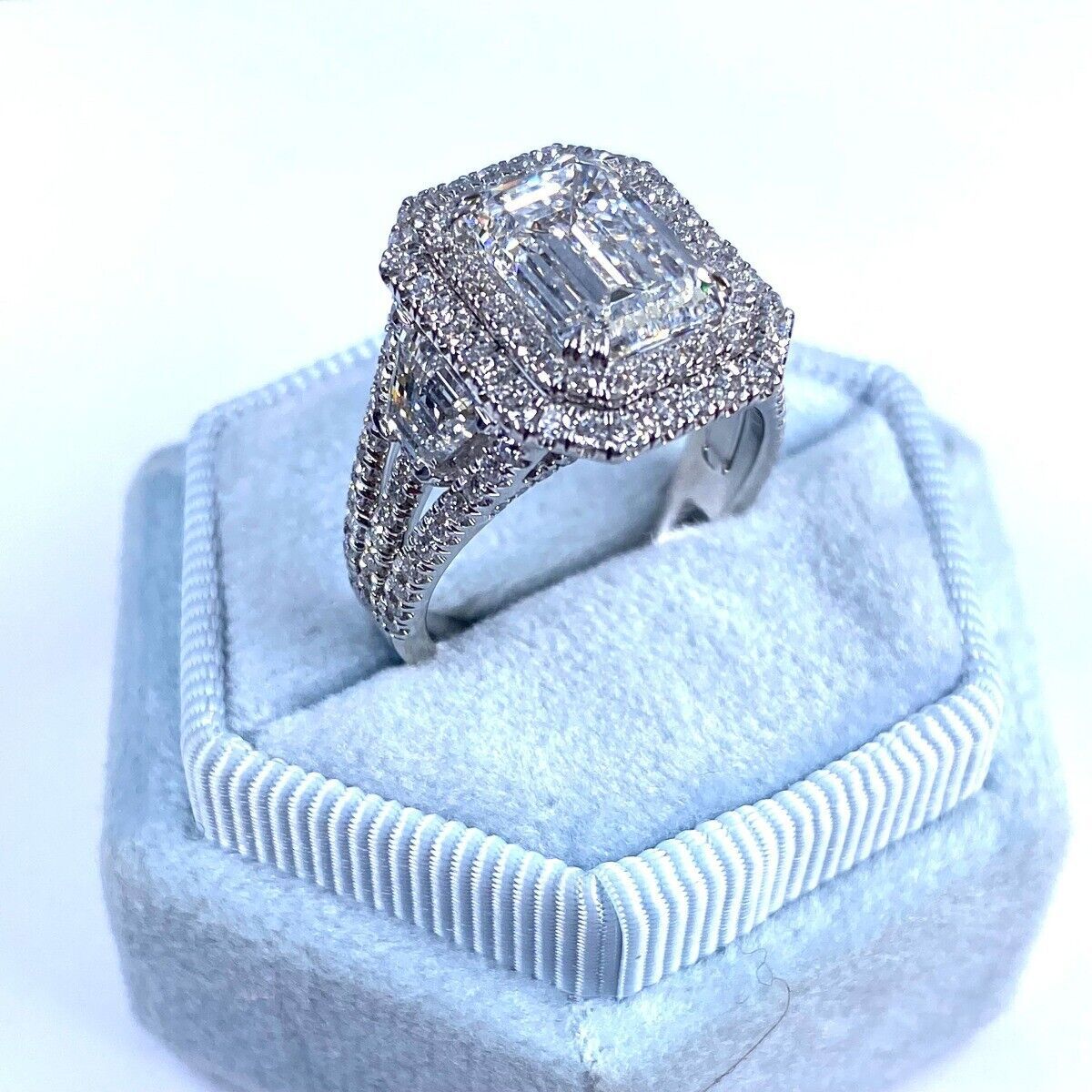 Spectacular diamond engagement ring features a stunning a 3.20 carat emerald cut lab grown diamond center accompanied by 2 trapezoid cut side lab grown diamonds in micro pave setting. The double halo of glittering colorless round cut lab grown diamonds elegantly frames the center diamond creating a dazzling look!! An emerald engagement ring is a timeless and elegant choice that will be cherished for years to come!!