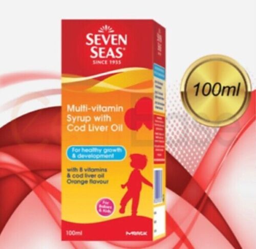 Lo sciroppo multivitaminico Seven Seas con olio di fegato di merluzzo fornisce 8 vitamine essenziali e DHA per gli importanti anni formativi dei bambini. Ha un delizioso sapore di vero succo d'arancia e non ha aromi e coloranti artificiali.
