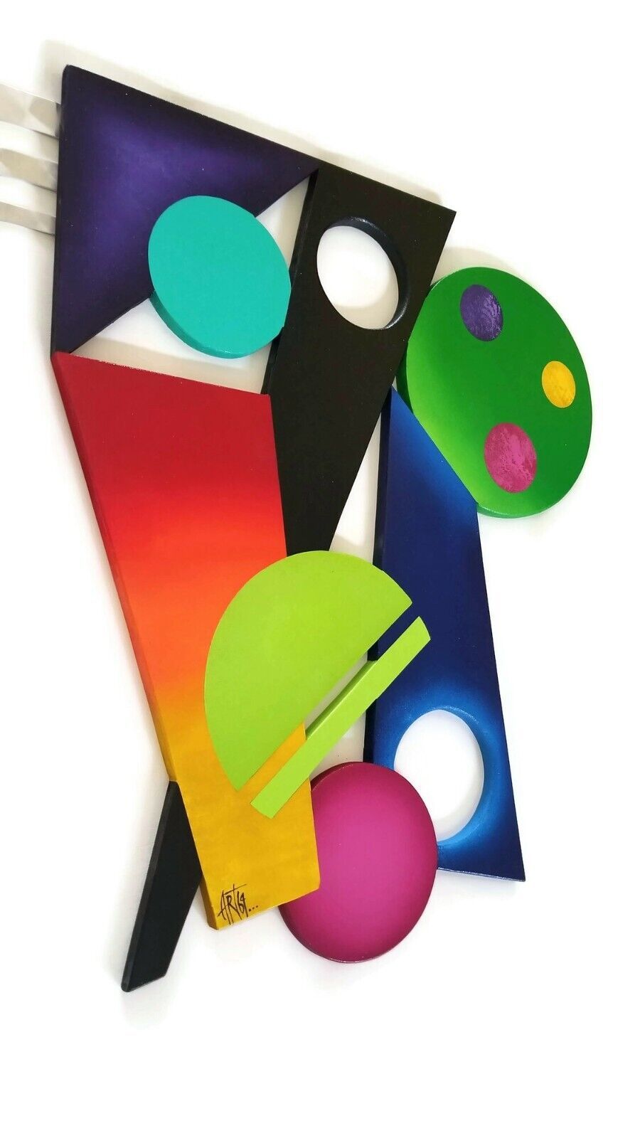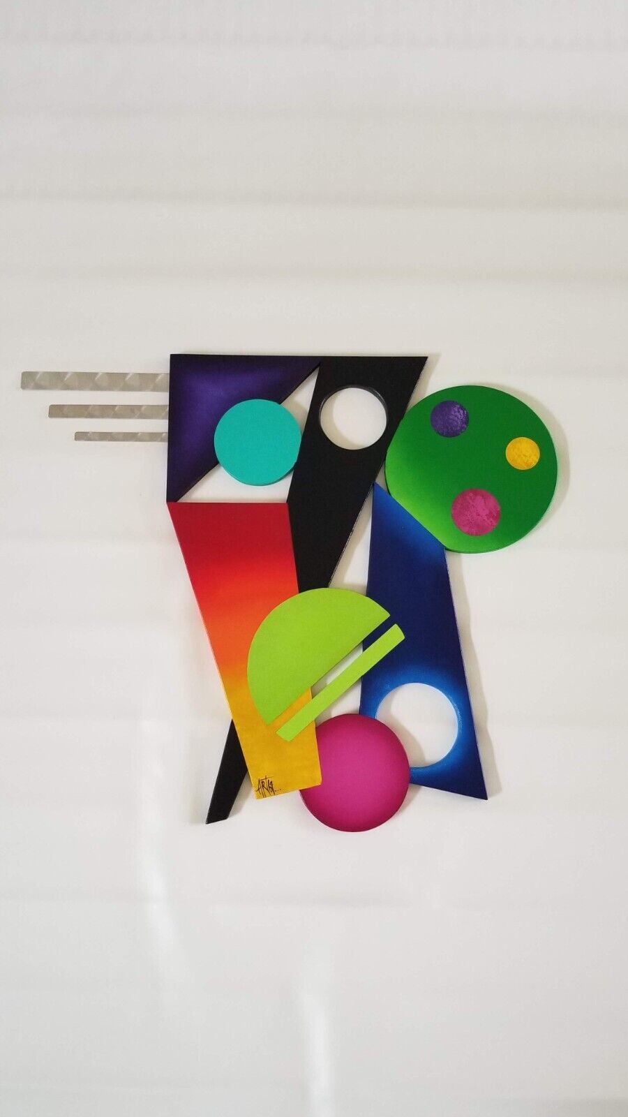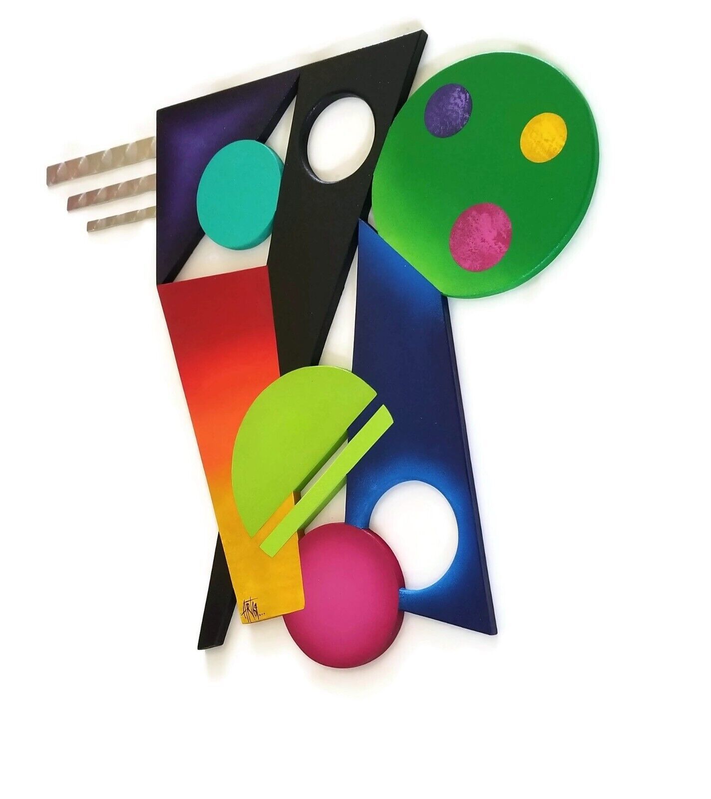 Colorful Contemporary Modern Abstract Wall sculpture, Wood Metal, 28x24 Art69