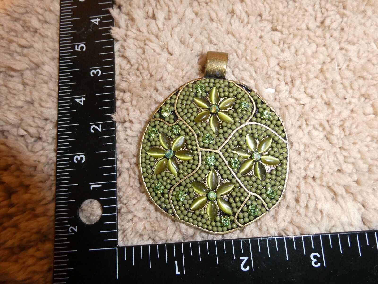 Vintage Brass Tone Metal Rhinestone Fancy Green Pendant 2 3/8" Wide