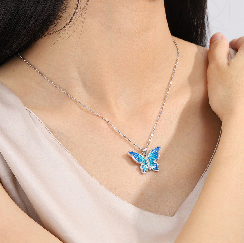 Authentic 925 Sterling Silver Gradient Blue Zircon Butterfly Pendant Necklace