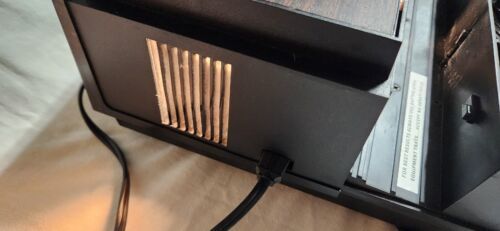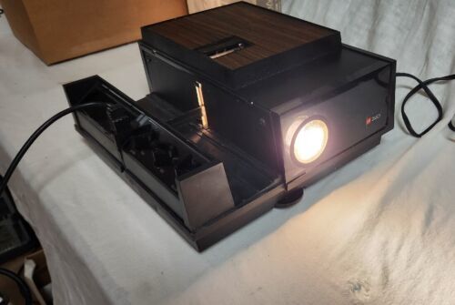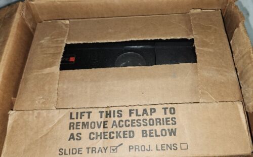 This unit powers up and the light comes on. Remote seems also to function as it should. Did not try with slides but it did cycle with remote. Comes with the original box. One of the plastic hinges on the lid is broken. Good vintage unit.
