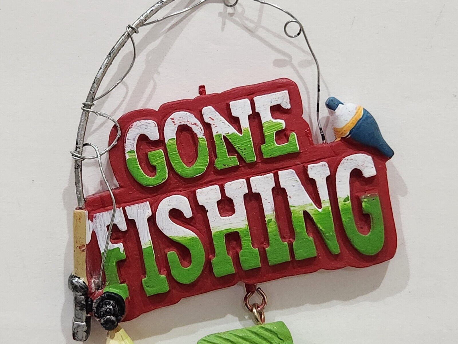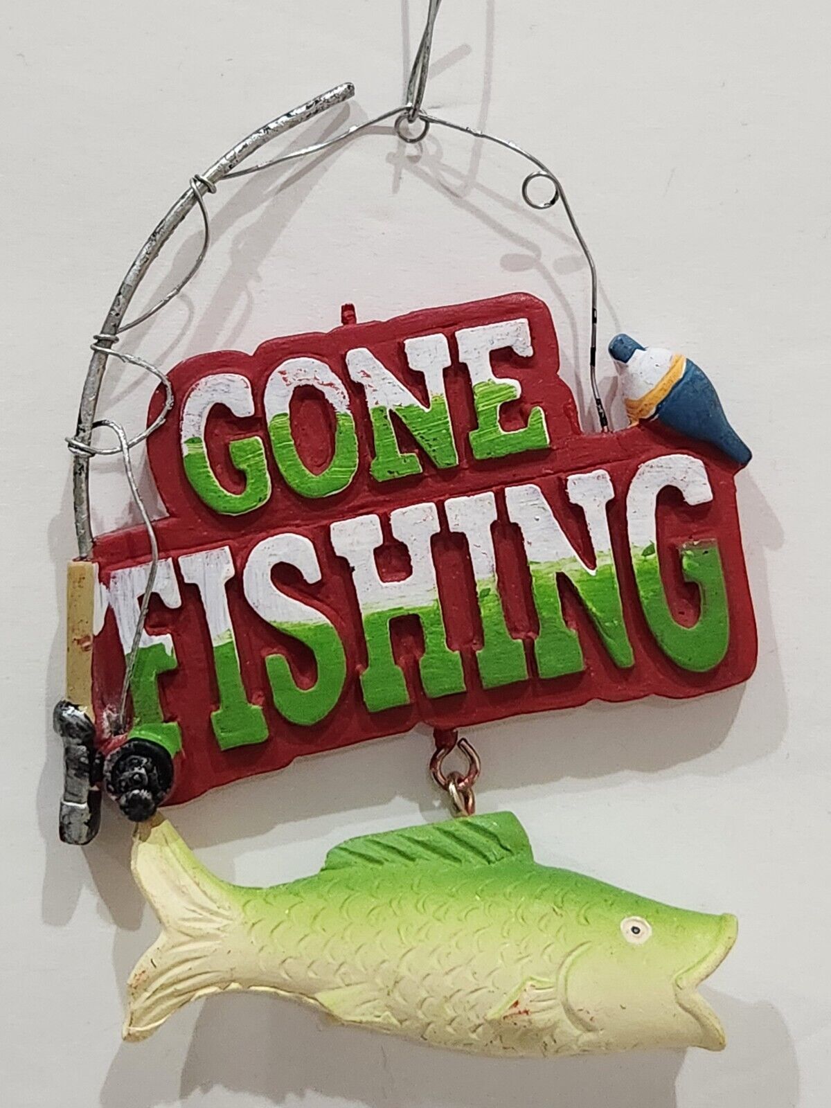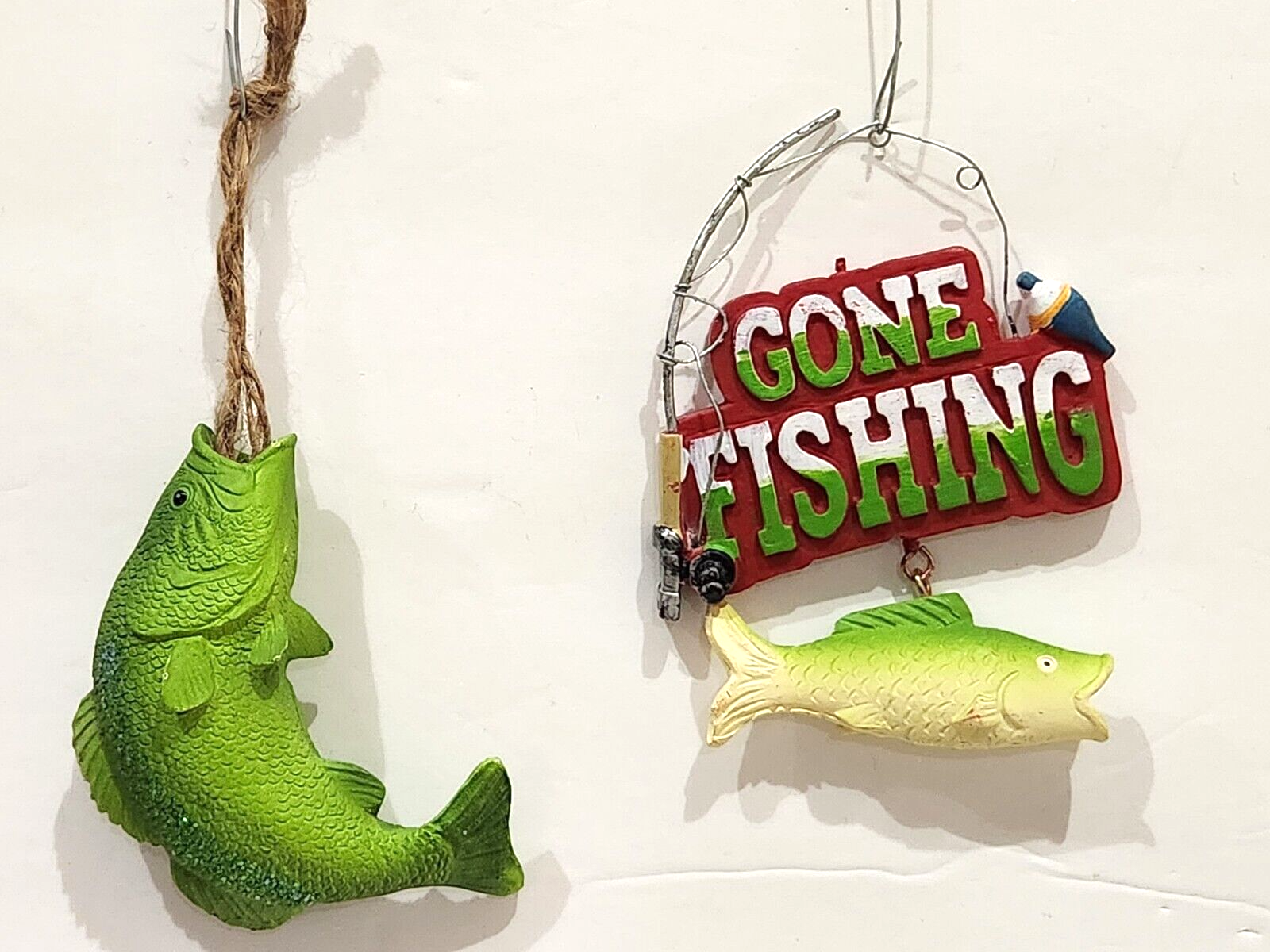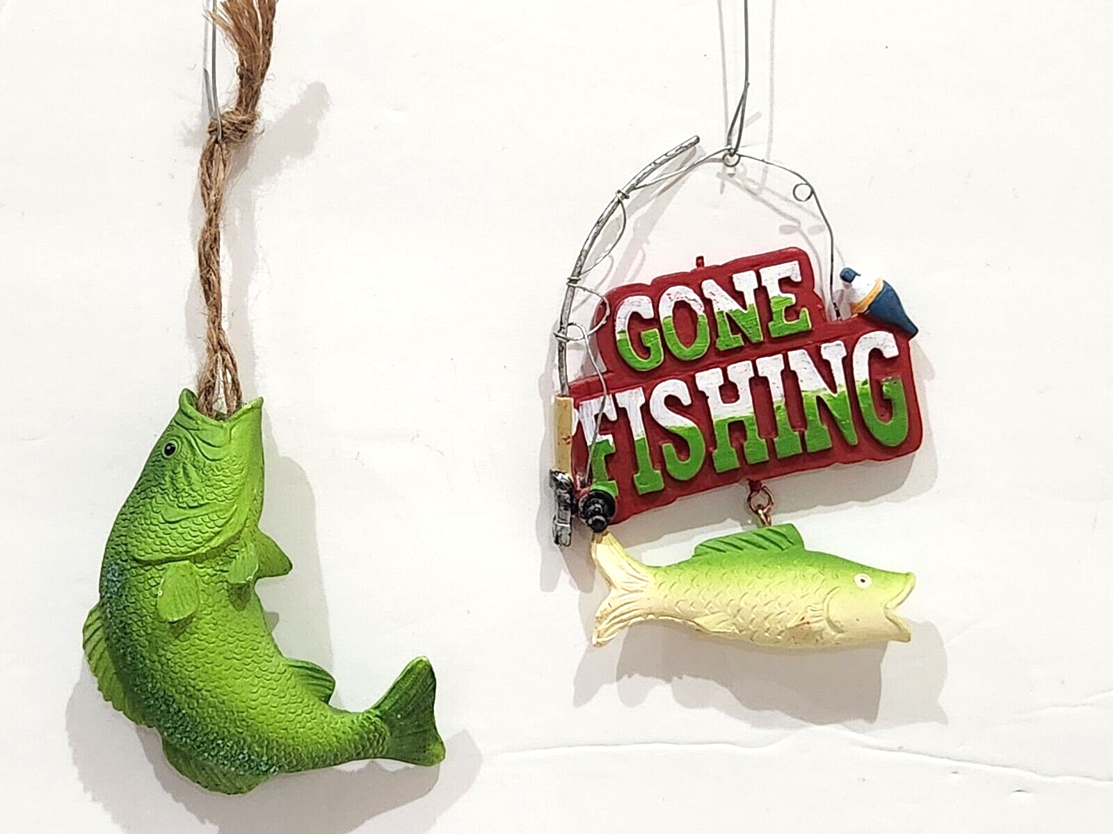 Up for sale we have a set of (2) adorable ornaments for your Christmas fishing tree decor. These are soooo cute! Fish has some glitter and measures approx3.5" wide x 2" tall. Gone fishing sign is approx 3" x 4". These feel like there made of resin.