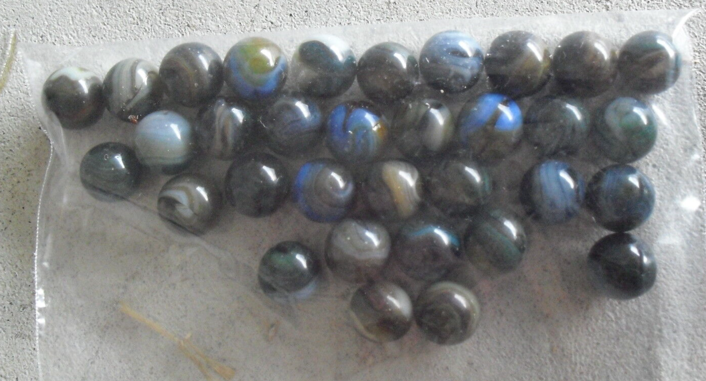 Very nice, vintage, lot of 33 old glass marbles, cool dark colors, mostly green with different swirls. Nice large lot in nice shape with some small nicks on them from play. Each is about 1/2 inch wide.