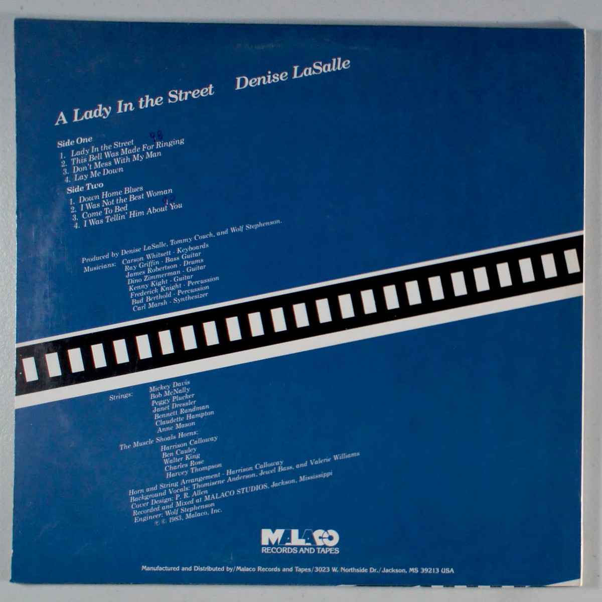 A Lady in the Street, by Denise LaSalle, reached No. 23 on the Top R B Albums Charts. This album includes three of LaSalle's hit singles: Down Home Blues, Lay Me Down, and the title-track. Robert Christgau wrote in Christgau's Record Guide: Rock Albums of the Seventies (1981): "LaSalle seems to be a songwriter first and a singer second, which may be why there's a certain professional anonymity about her unusual moods. But the voice is there?sensual, warm, even wise, ideal for [producer] Willie Mitchell's meditative Memphis funk."