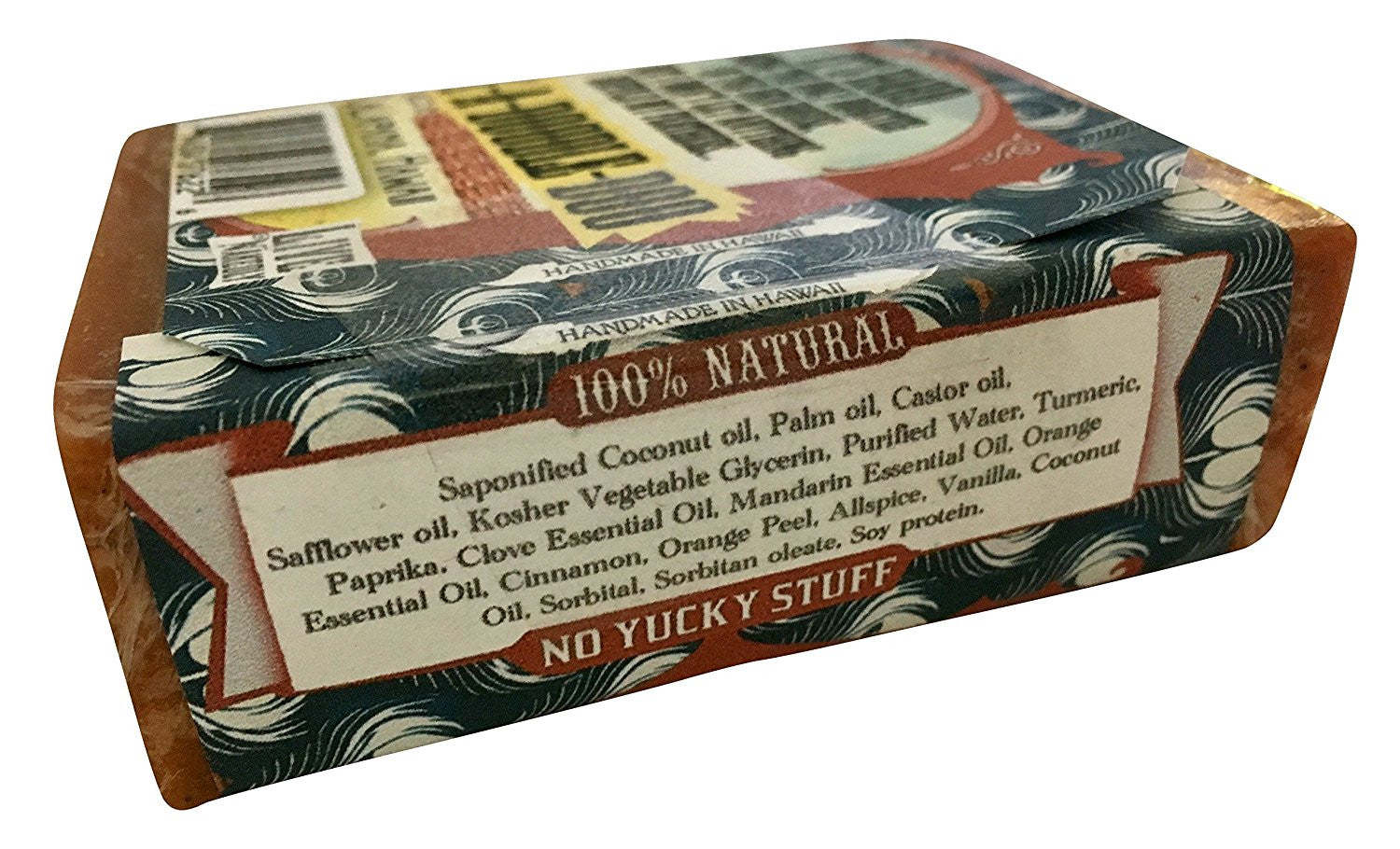 No Yucky Stuff! Our Soap recipes are 100% Natural and Vegan Friendly! Saponified Vegetable Oils (Coconut, Castor and Safflower) Kosher Veggie Glycerin. Highest quality essential oils herbs and spices. (Organic when available) Sorbital (natural thickener) Purified Water Sorbitan oleate (natural emulsifier) Absolutely no detergents, surfactants, sulfates, artificial scents, colorizers, or petroleum products of any kind. Our Labels are printed on 100% recycled paper. Sodium hydroxide (natural saponifier) 100% Natural Ingredients: Saponified Coconut, Palm, Castor Safflower oils, Kosher Vegetable Glycerin, Purified Water, Turmeric, Paprika, Clove Essential Oil, Mandarin Essential Oil, Orange Essential Oil, Cinnamon, Orange Peel, Allspice, Vanilla, Organic Coconut Oil, Sorbitol, Sorbitan oleate, Oat protein.