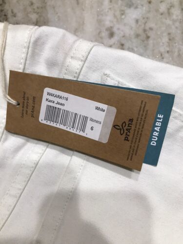 prAna Women's White Kayla Jean Size 2/26 NWT. Style W4117RG02. Made from our original organic soft performance stretch Kara denim and cut for a fitted silhouette. This mid-rise jean is complete with traditional 5-pocket styling and a narrow leg. Machine Wash. Organic cotton/polyester blend soft stretch 'Kara' denim.