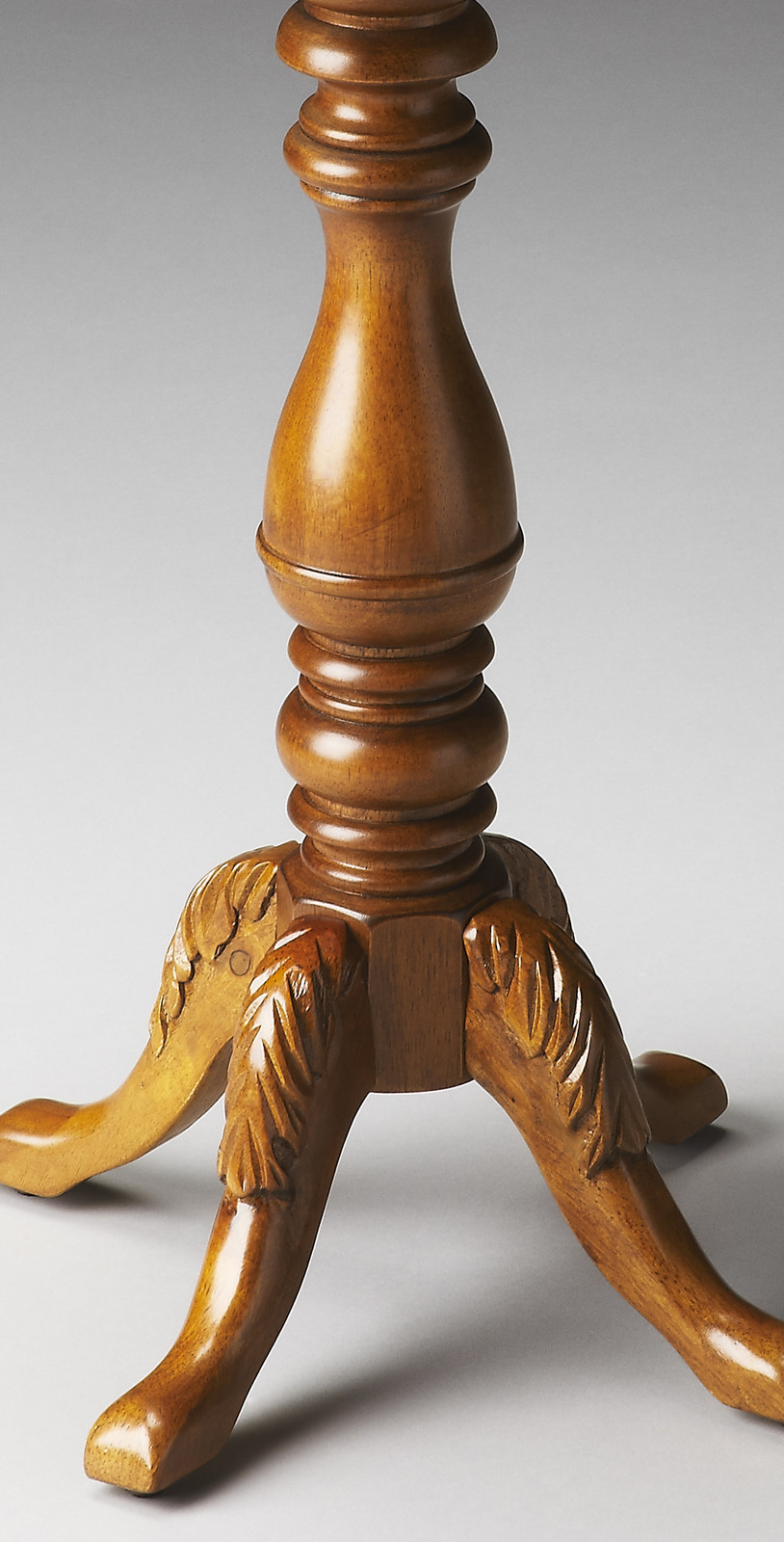 Traditional yet updated pedestal end or side table with a round floral scalloped raised edge tabletop.