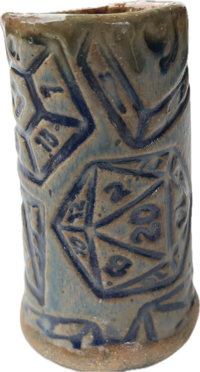 This shot glass has intricate designs of polyhedral dice, including a 20-sided die (d20). The shot glass has a rustic, handcrafted appearance with blue patterns on a beige background. This item is interesting and relevant for game enthusiasts, especially those who enjoy tabletop games like Dungeons Dragons.