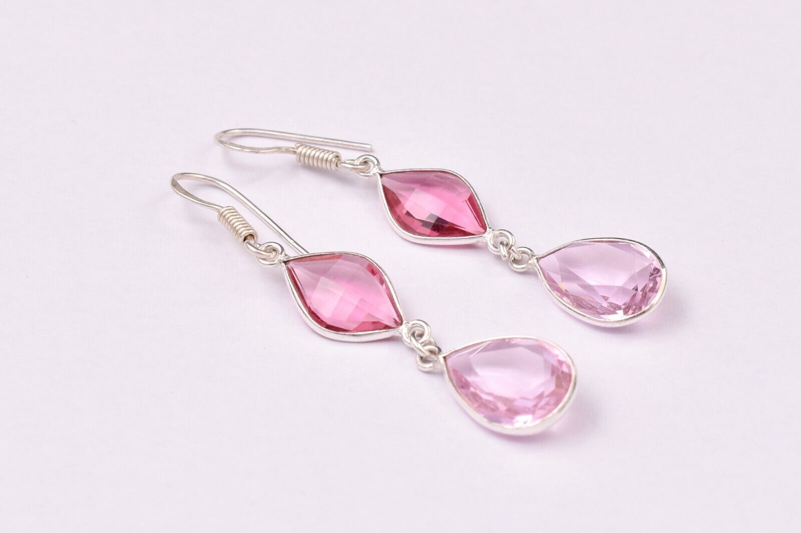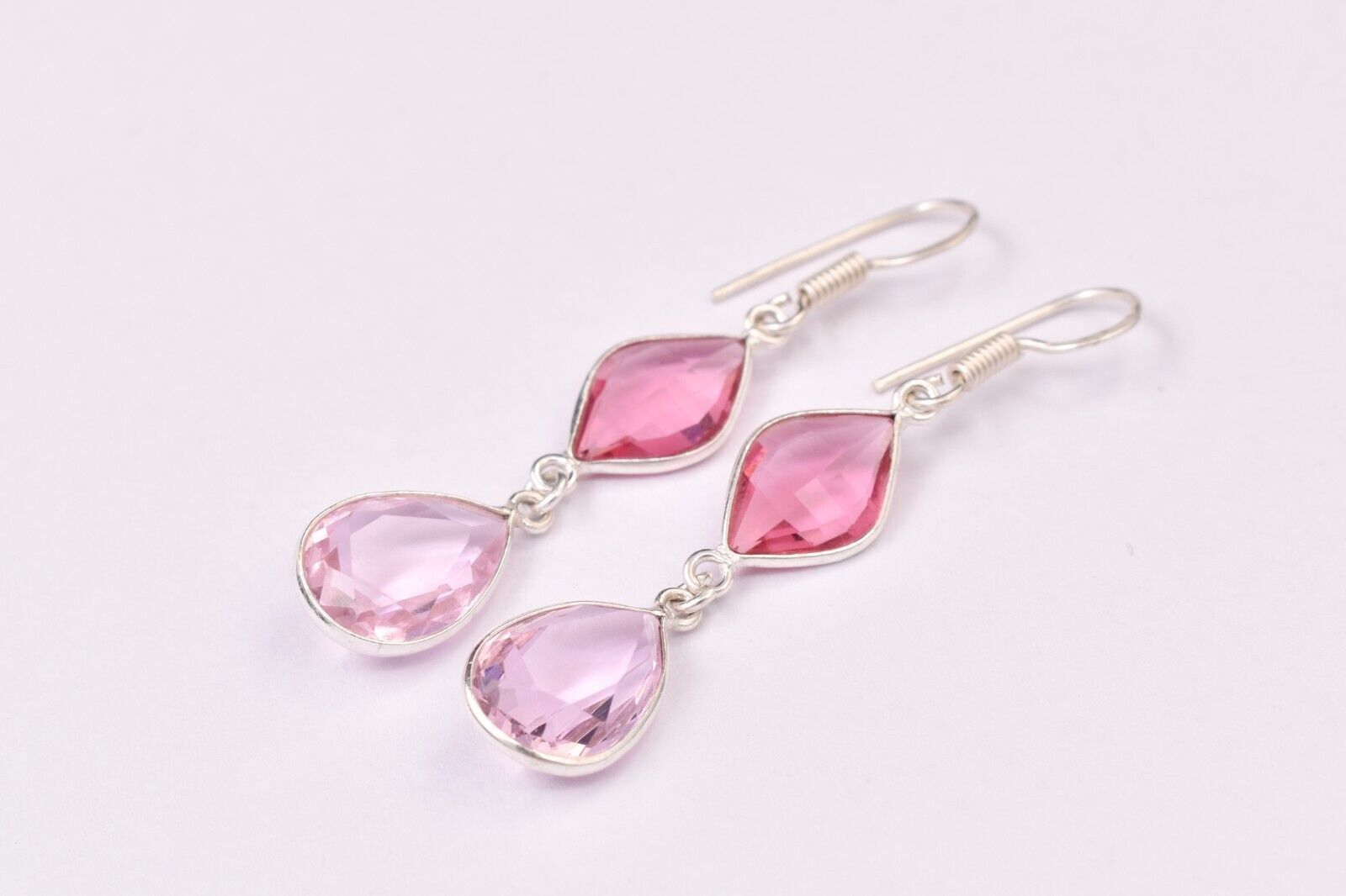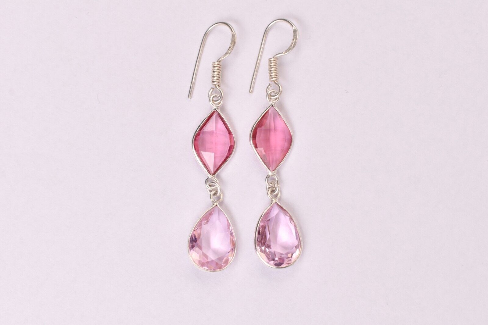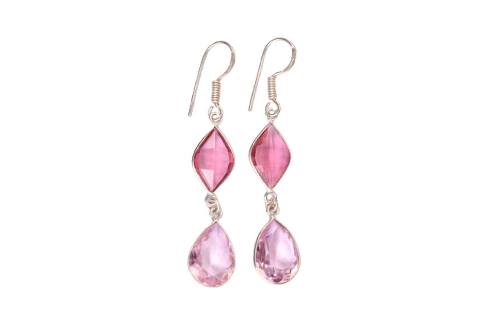 925 Sterling Silver Handmade Pink Quartz Pear Shape Women Vintage Earrings Gift