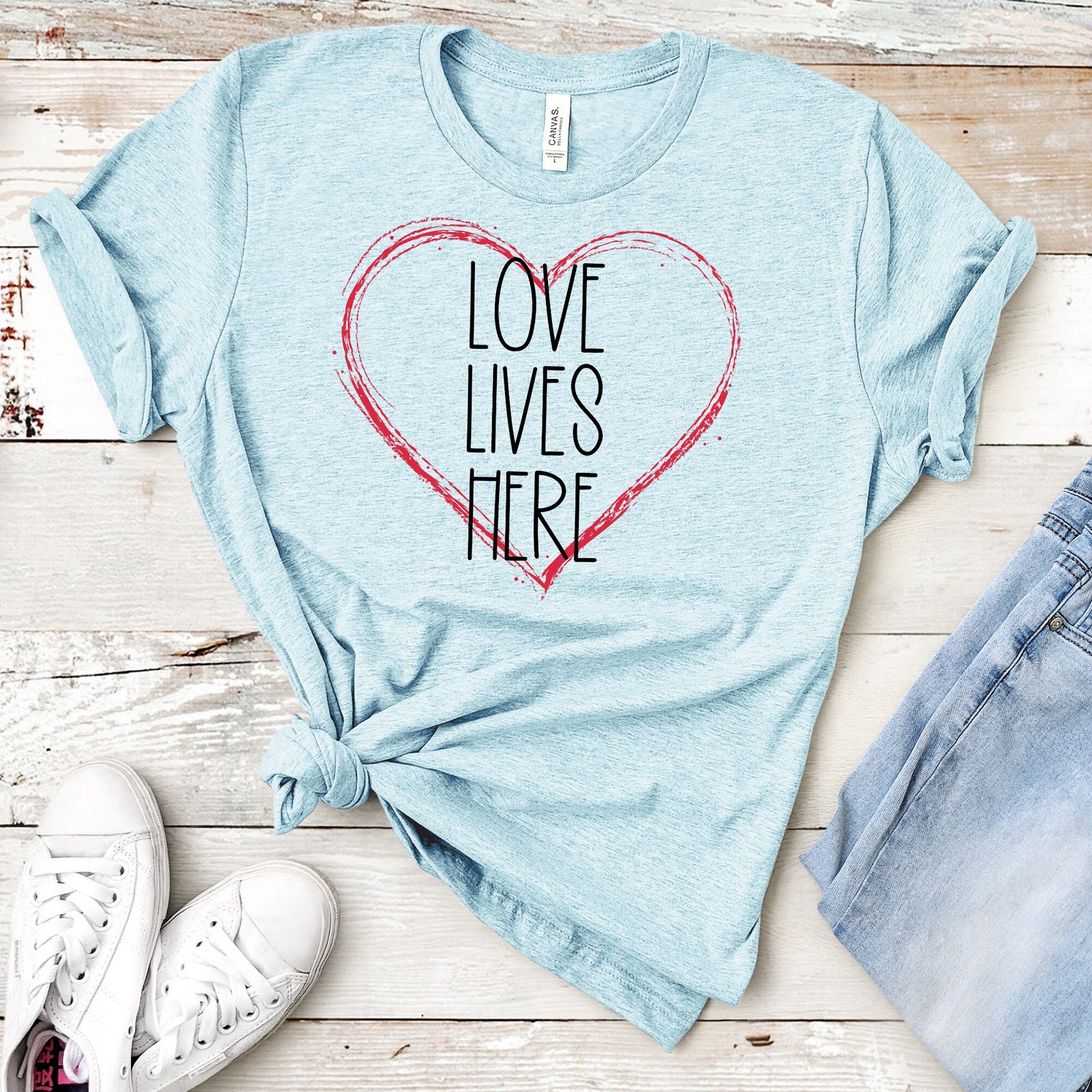 Love lives here in a distressed heart is a fun design put on a Unisex Staple graphic T-Shirt that feels soft and light with just the right amount of stretch.