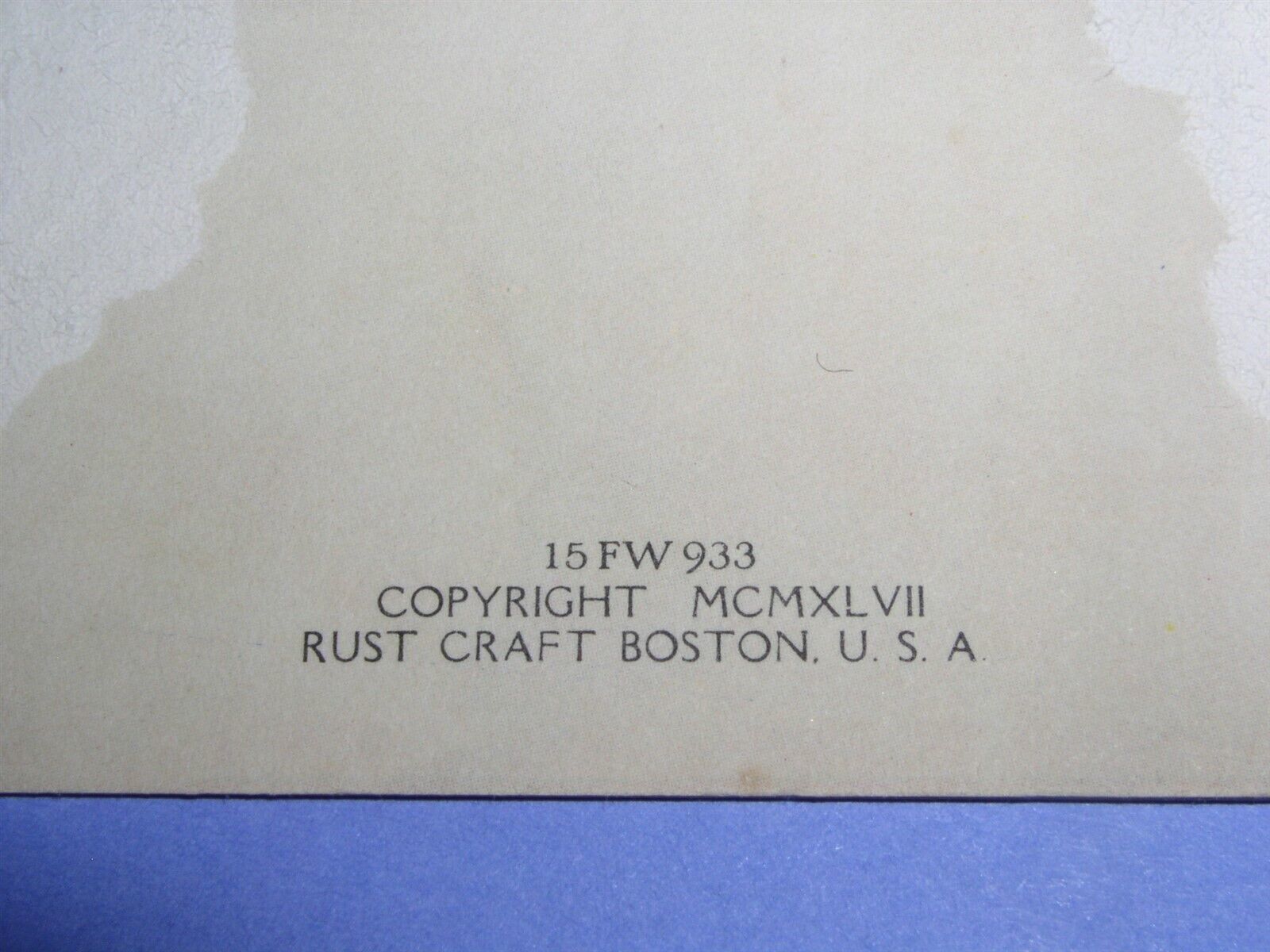 Condition is VG++ (very good ++). Light age streak to the left as depicted in photo. This has been removed from another scrapbook, so the back cover has removal marks and tears. The front picture is great as depicted in photo. Inside personal sentiment/date can be camouflaged with creative embellishments, or cut altogether. Front/inside pic/sentiment can be cut and pasted into your scrapbook for that special "vintage look", or nicely matted and framed.