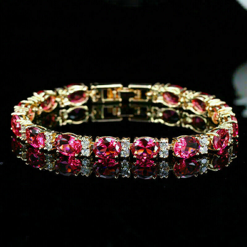 Bracelet Tennis Fantaisie Rubis Rose CZ Coupe Ovale 10CT Plaqué Or Jaune...