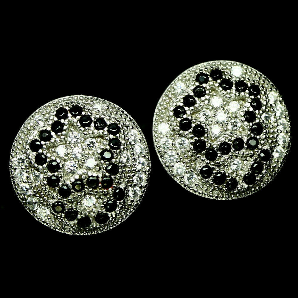 Boucles d'Oreilles Rondes CZ Noires et Blanches 2.55Ct Plaqué Or Blanc 14K...