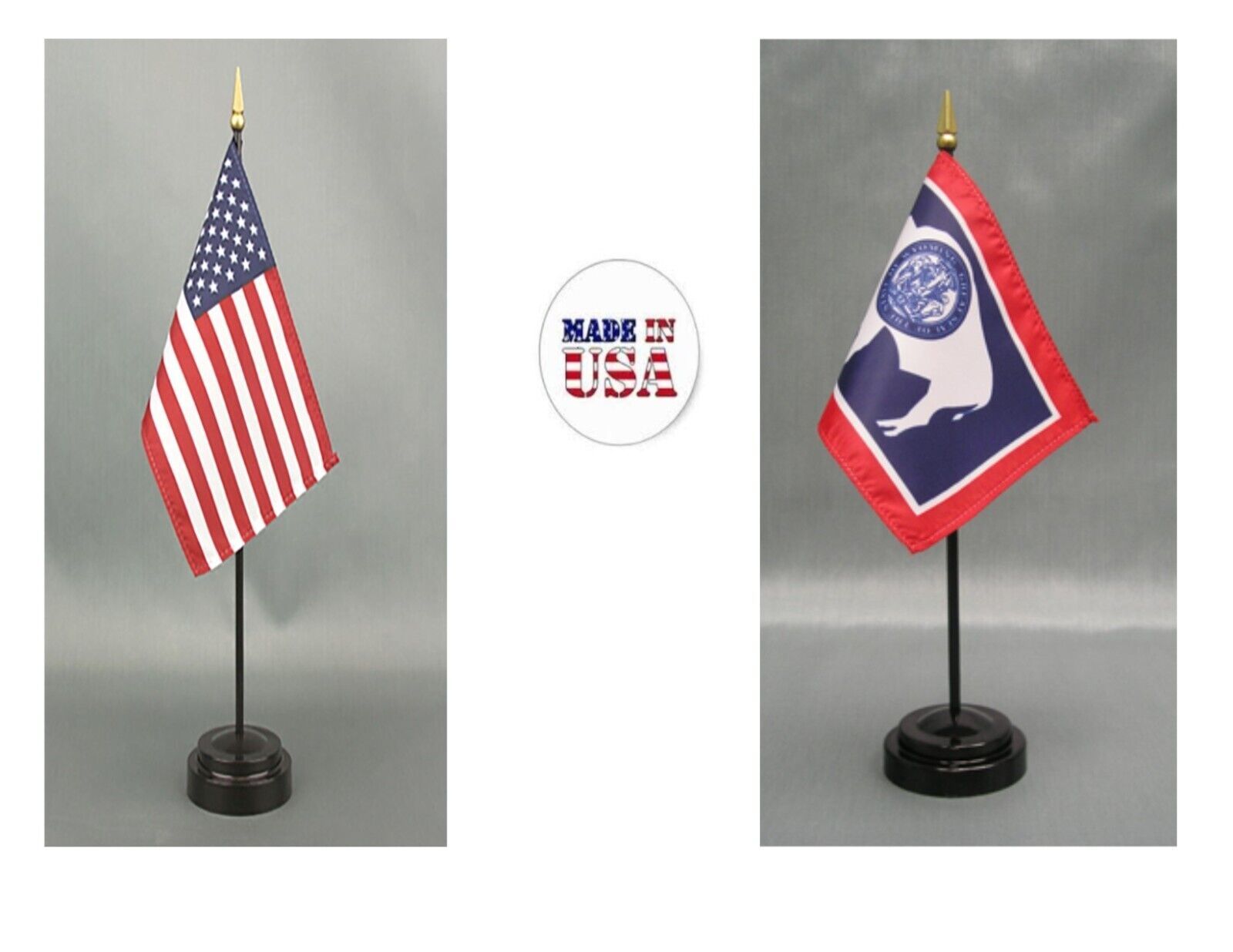 Made in The USA--1 American and 1 Wyoming Rayon 4"x6" Desk Flags & two bases