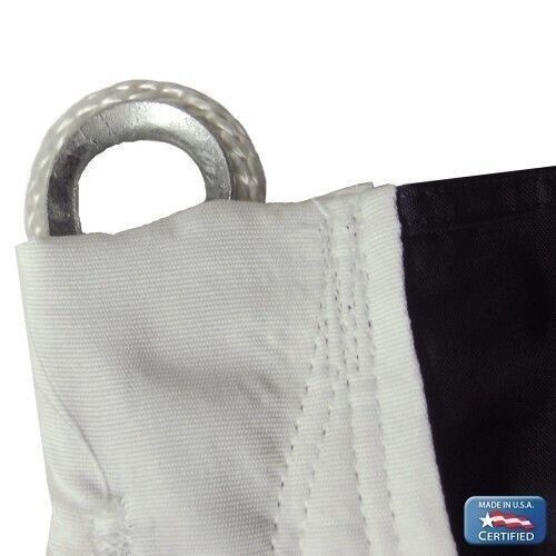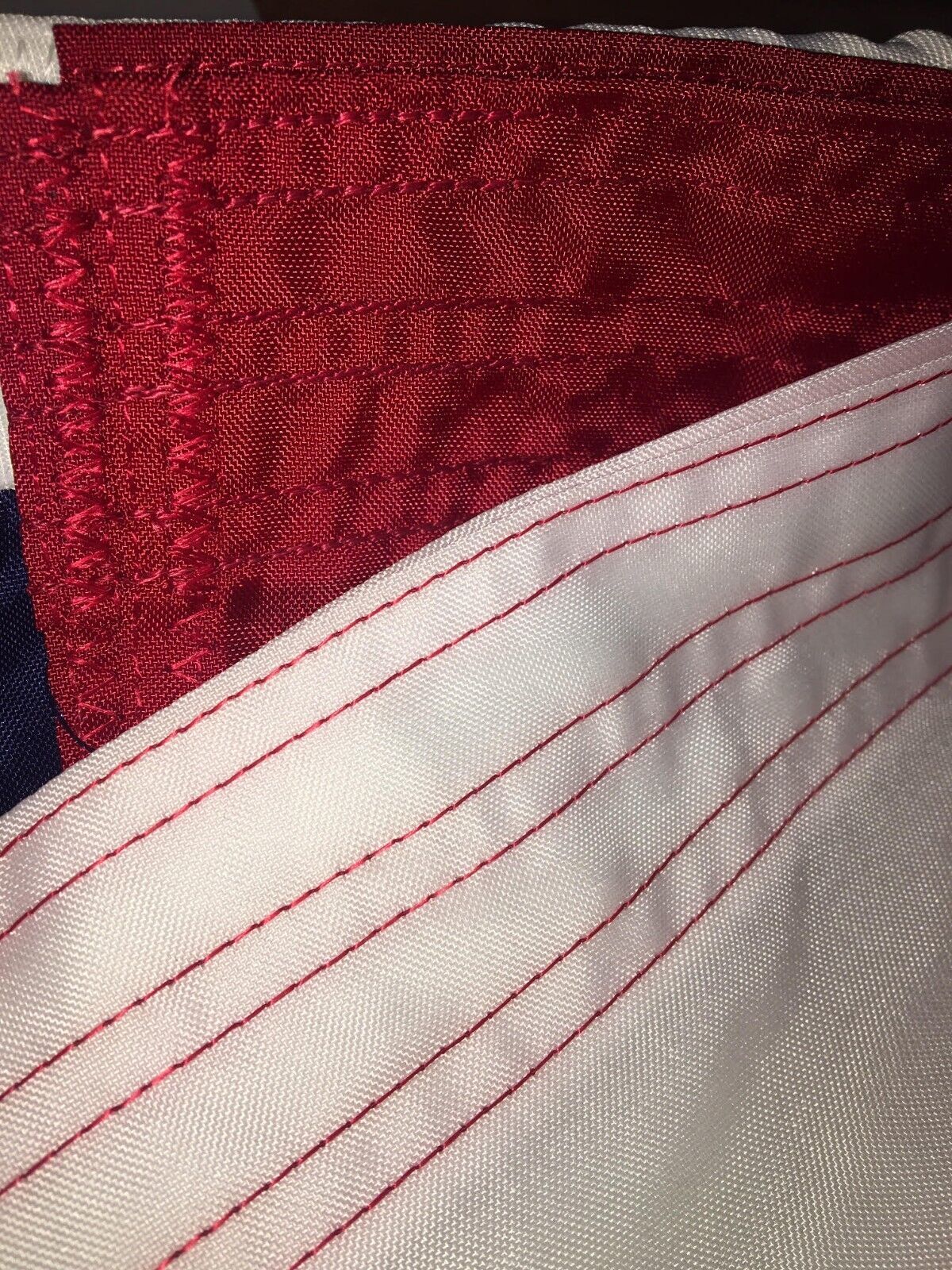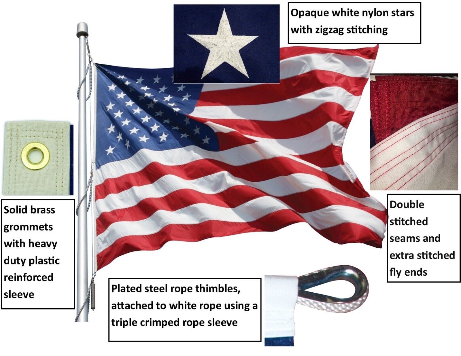 All of our American made flags have embroidered stars and sewn stripes. Each flag smaller then 8x12 feet has two heavy duty brass grommets. Flags 8x12 feet or larger have a rope and thimble heading which is used to attach the flags to a pole.