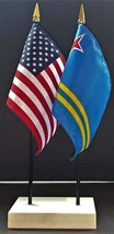 1 American & 1 Aruba Mini Rayon 4"x6" Desk Flag Set with White 2-Hole Base