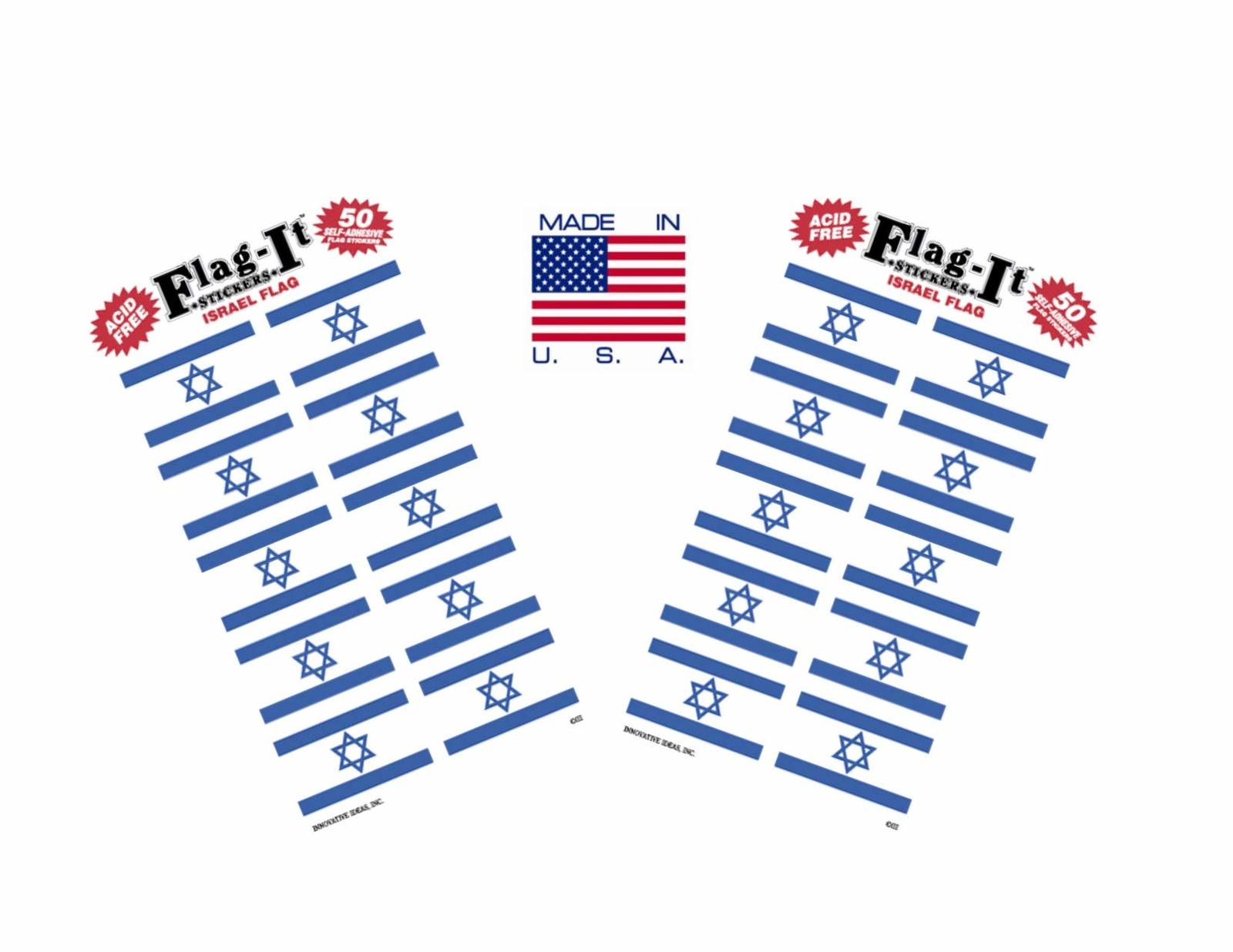 Includes 2 packs of 50 Israel Stickers. ''Flag-It'' brand stickers are the best on the market. There are 10 each - 1" x 1 oe" stickers per pages and 5 pages of stickers per pack therefore giving you 100 stickers. Printed on high quality paper stock with screen printed inks. Great for Classrooms, envelopes, greeting cards, games, rewards, gift wrapping or just about anywhere you want to apply a sticker. Made in the USA.