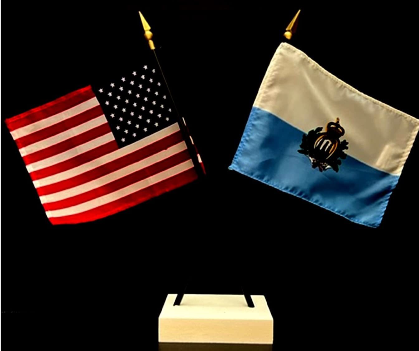 Made in USA. 1 American and 1 San Marino Miniature Rayon 4"x6" Office Desk Flag.