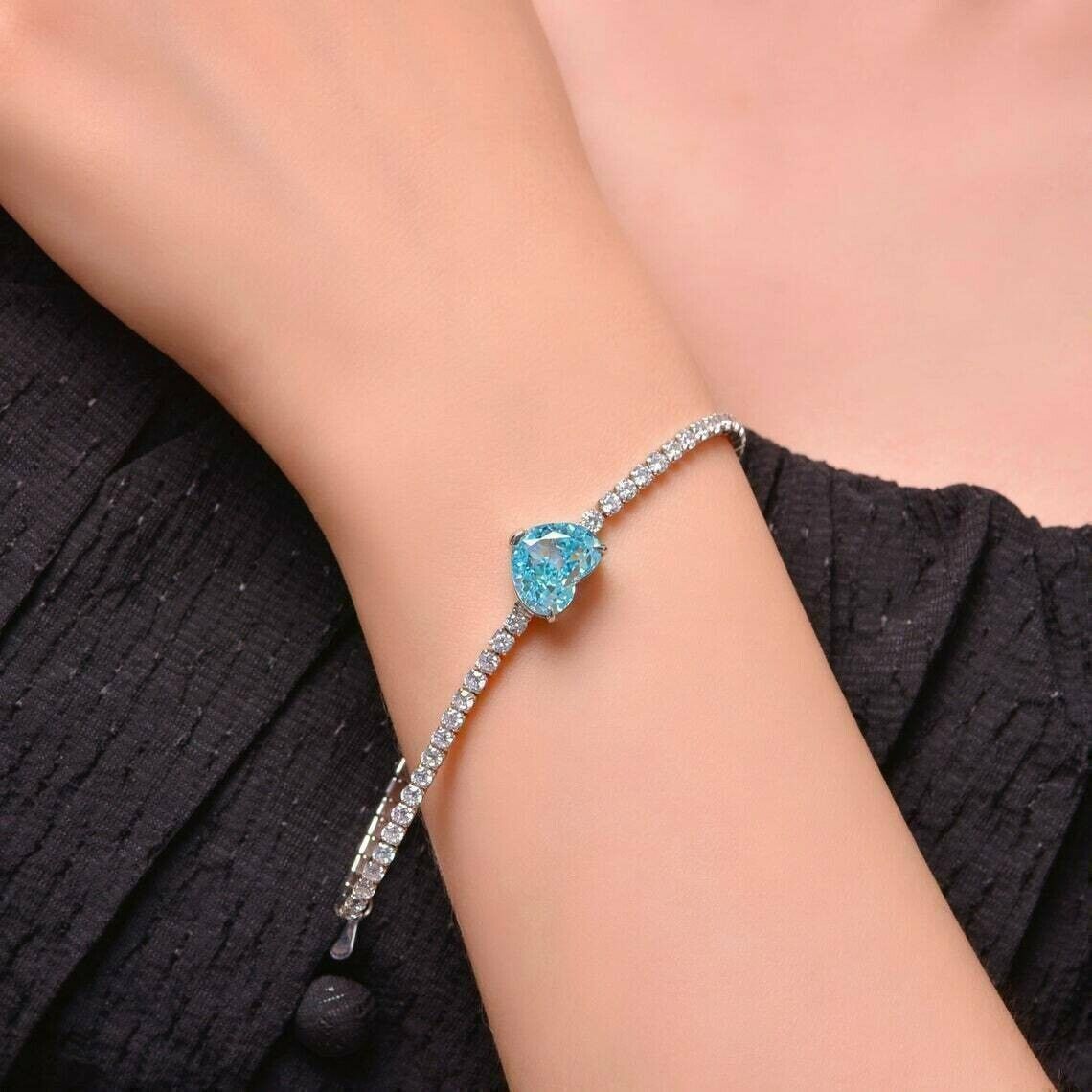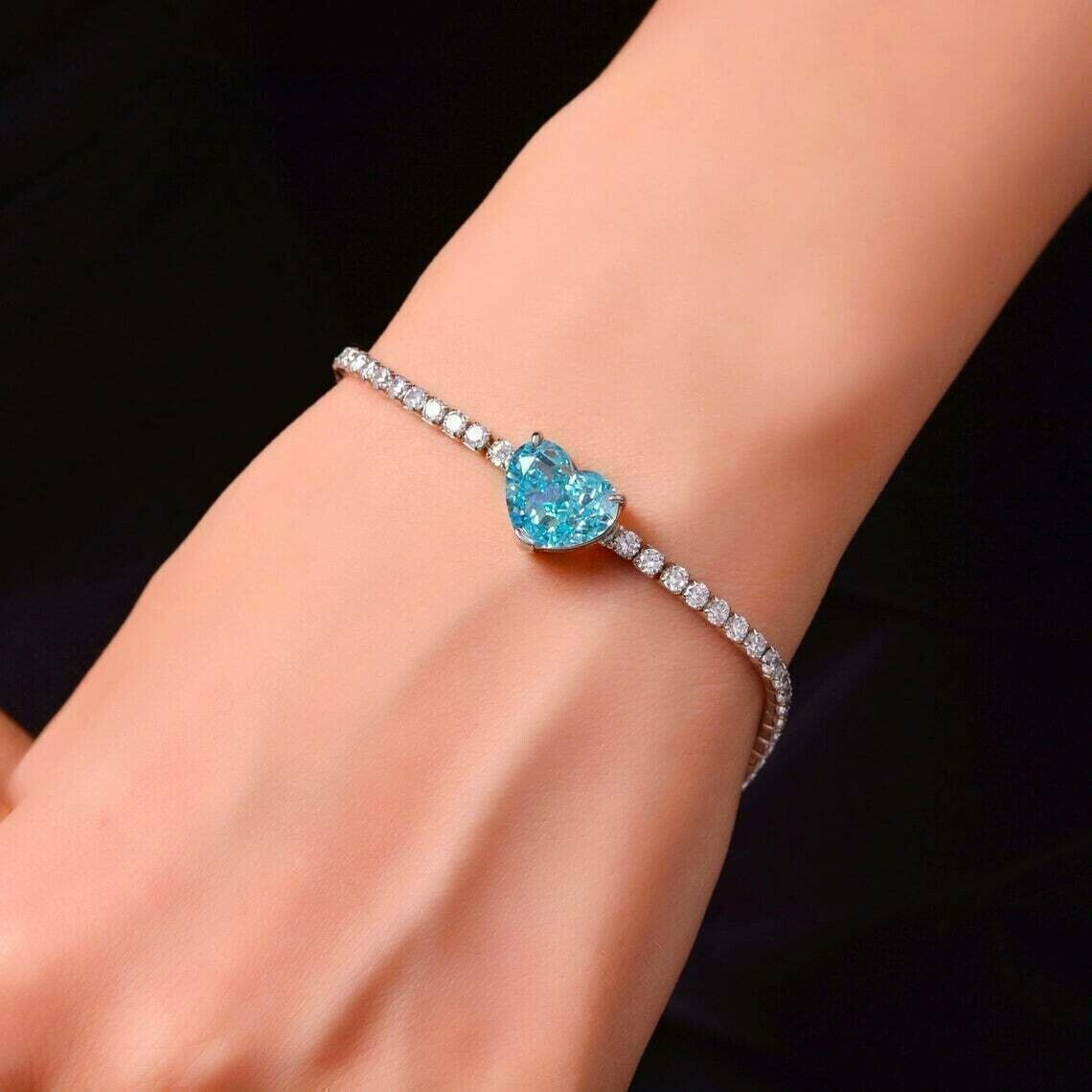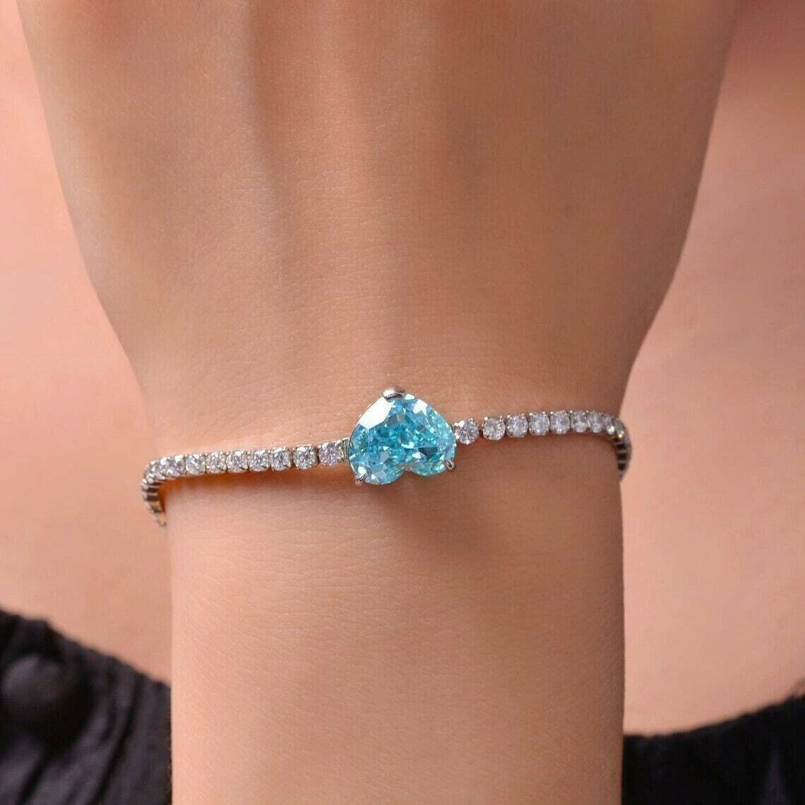 Bracelet Tennis Femme Topaze Bleue CZ Coupe Coeur 8Ct Plaqué Or Blanc 14K-Ruban