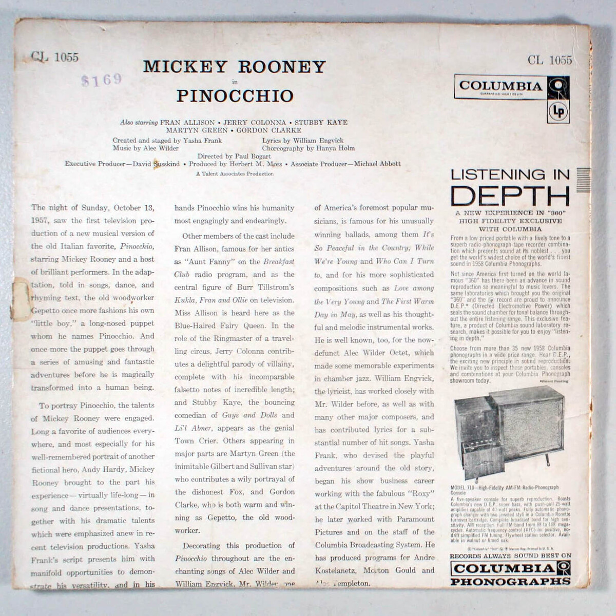 Pinocchio, performed by Mickey Rooney, was the soundtrack from the television musical version of the old Italian favorite. Once more the puppet goes through a series of amusing and fantastic adventures before he is magically transformed into a human being. This adaptation featured Rooney as Ponocchio, and also starred Fran Allion, Jerry Colonna, Stubby Kaye, and Martyn Green. This production was created and staged by Yasha Frank, with Alec Wilder and William Engvick composing the music and lyrics.