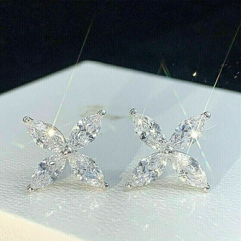 1.50Ct Marquise Cut CZ Fleur Boucles d'Oreilles Plaqué Or Blanc 14K-Argent