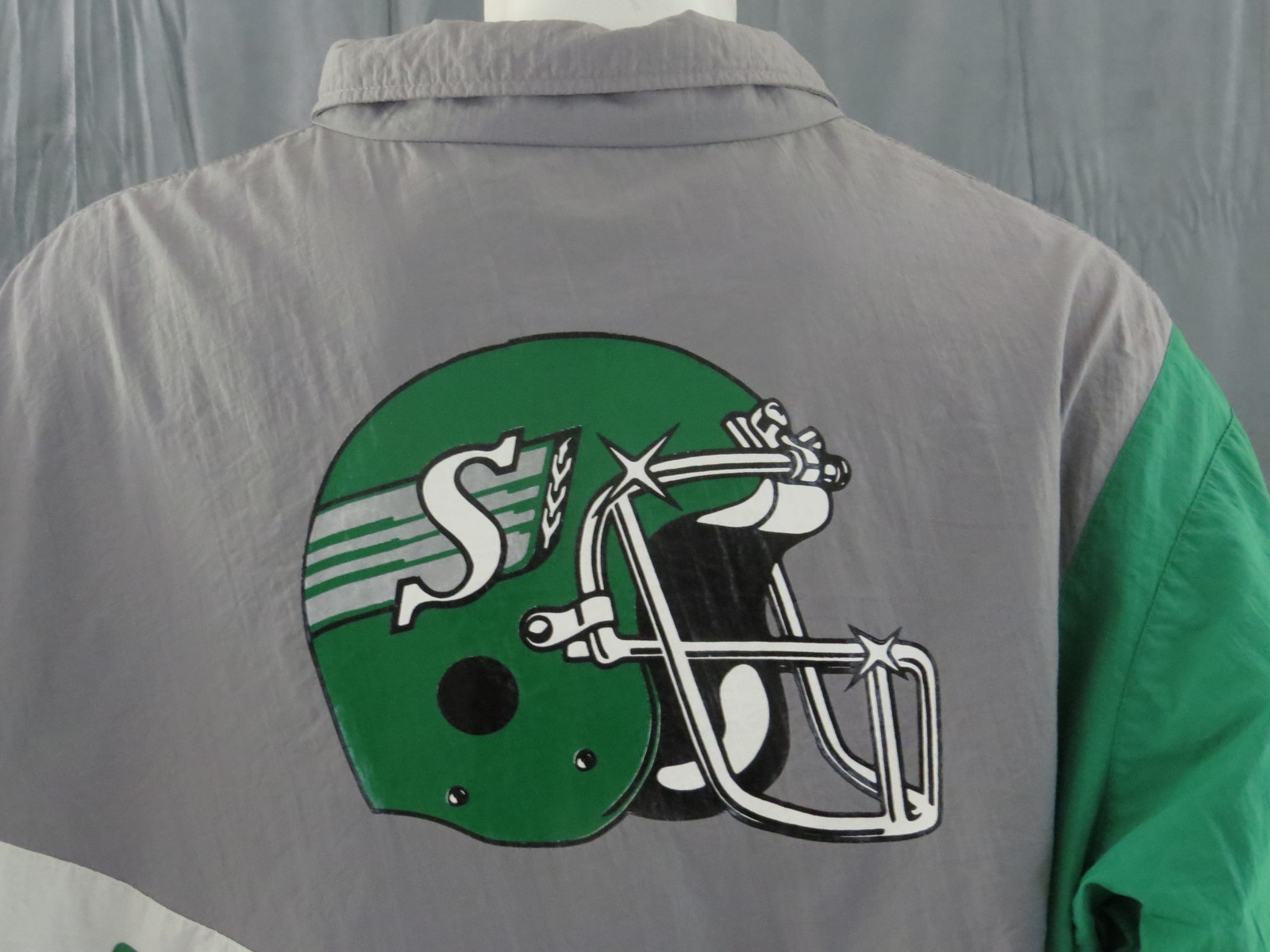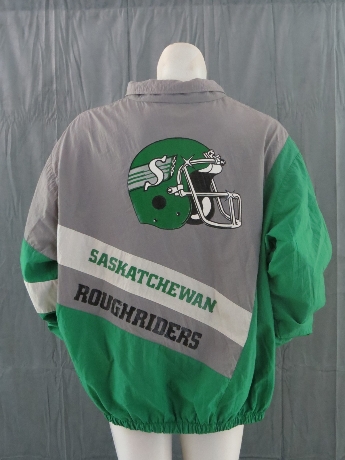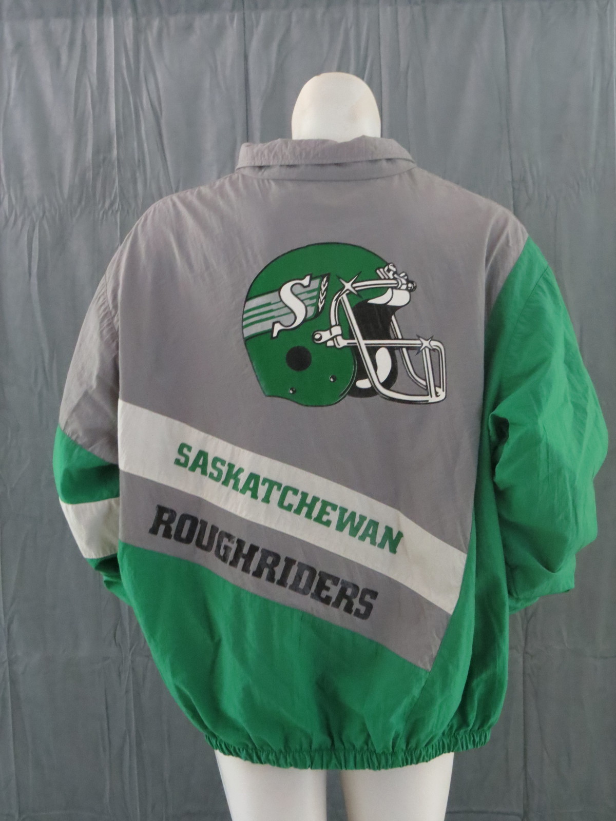 Up for sale is a vintage Saskatchewan Roughriders jacket by Midwest Sportswear. The jacket is a colour block jacket with a grey body, green sleeves and white accents. The front of the jacket has the Great Western Brewery and Midwest Sportswear logos screened on. The back of the jacket has a large Saskatchewan Roughriders helmet screened on with Saskatchewan Roughriders underneath. What an amazing vintage jacket do not miss out on it.