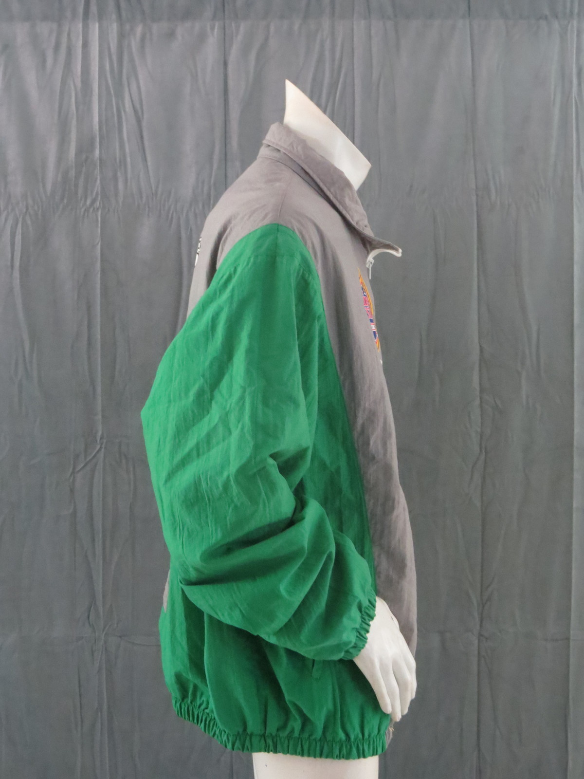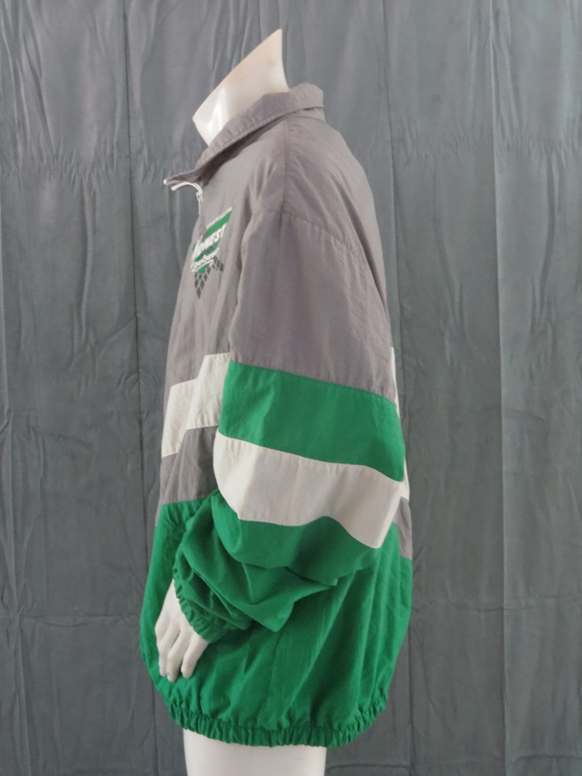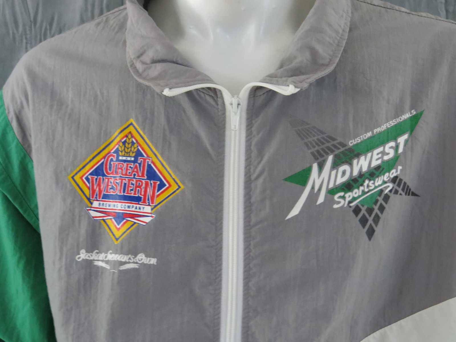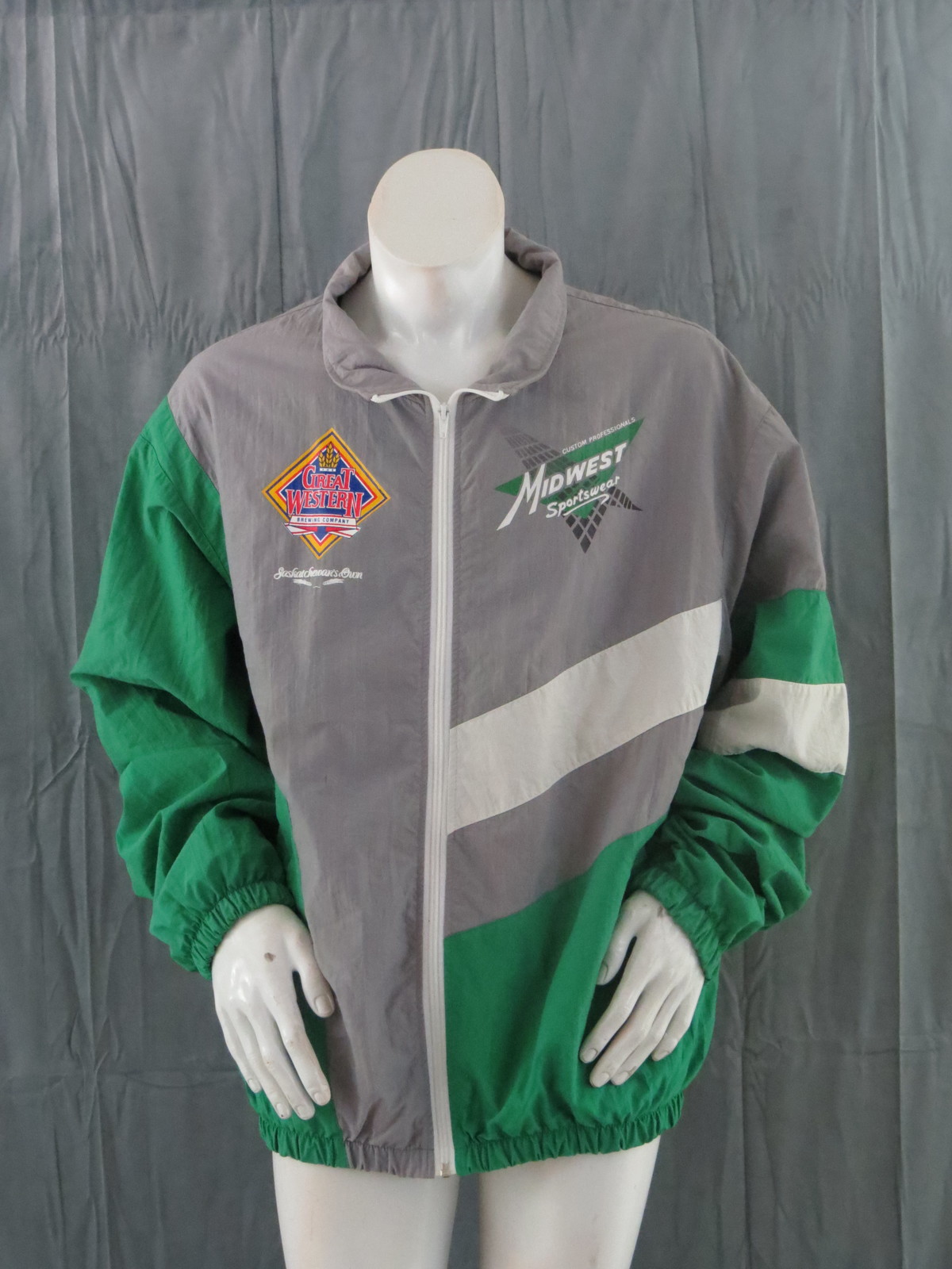 Up for sale is a vintage Saskatchewan Roughriders jacket by Midwest Sportswear. The jacket is a colour block jacket with a grey body, green sleeves and white accents. The front of the jacket has the Great Western Brewery and Midwest Sportswear logos screened on. The back of the jacket has a large Saskatchewan Roughriders helmet screened on with Saskatchewan Roughriders underneath. What an amazing vintage jacket do not miss out on it.