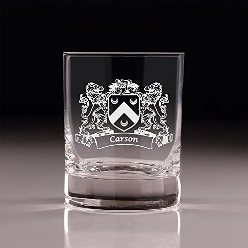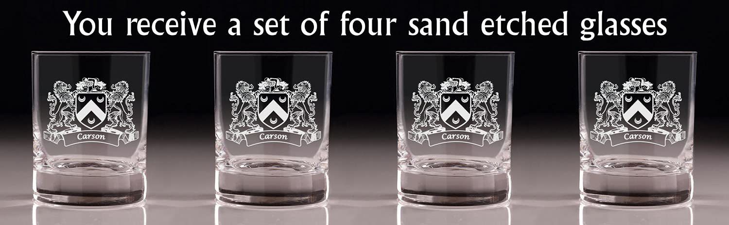 Carson Irish Coat of Arms Old Fashioned Tumblers - Set of 4. Sometimes, bigger is better! These taller, wider tumbler glasses are perfect for craft cocktails and whiskey. It's larger size allows room for our fan favorite "Lions" design, which is expertly and permanently sand-etched into each tumbler with your very own Irish Coat of Arms and Surname! These lavish Master's Reserve glasses undergo DuraTemp treatment to increase chip resistance, feature a clean beadless rim, thin walls, and a heavy base with a luxurious feel. Each glass was made to complement your finest whiskies and elevate the presentation and experience of your drink.